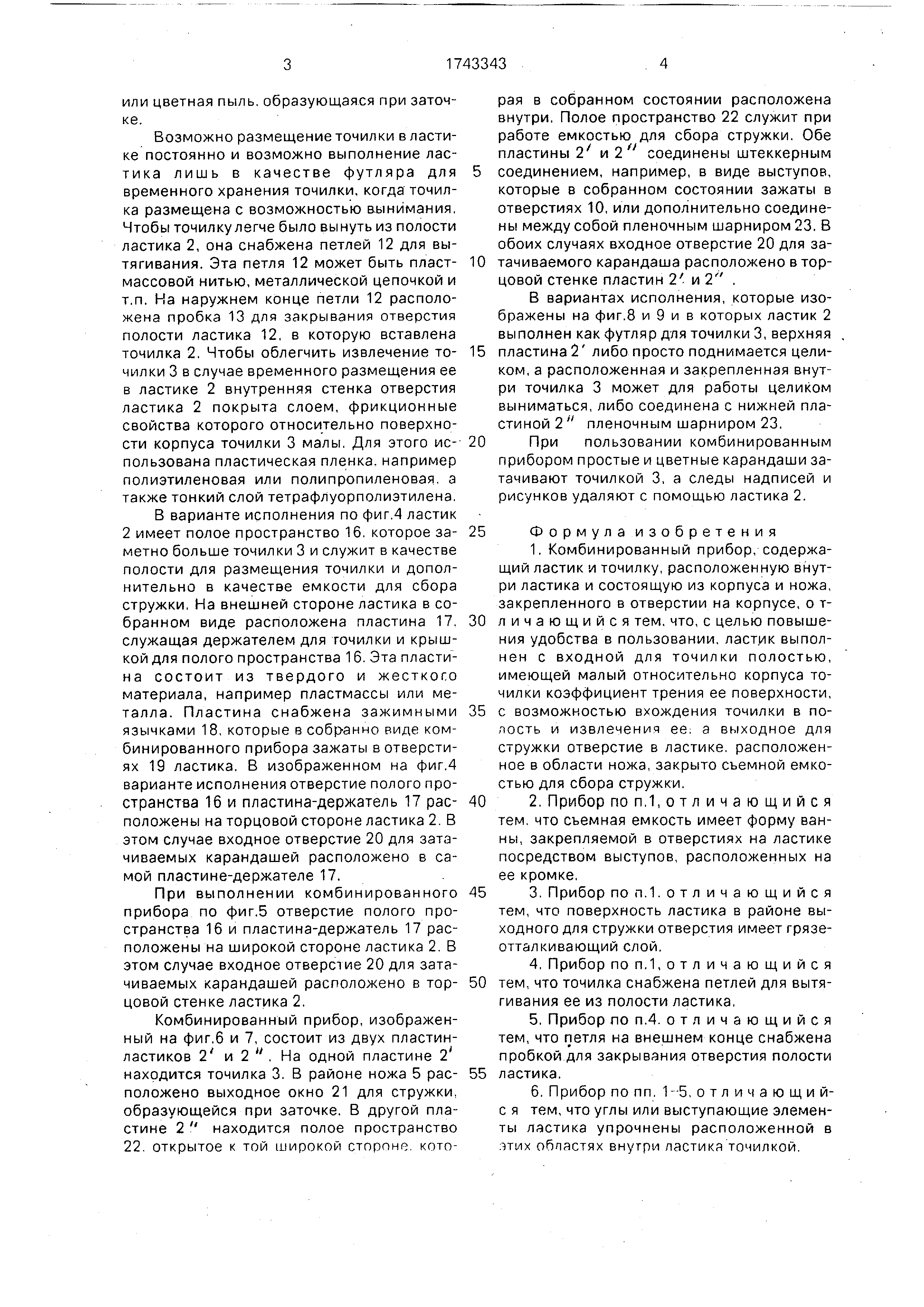 При выполнении комбинированного прибора по фиг.5 отверстие полого пространства 16 и пластина-держатель 17 расположены на широкой стороне ластика 2. В этом случае входное отверстие 20 для затачиваемых карандашей расположено в тор- цовой стенке ластика 2.