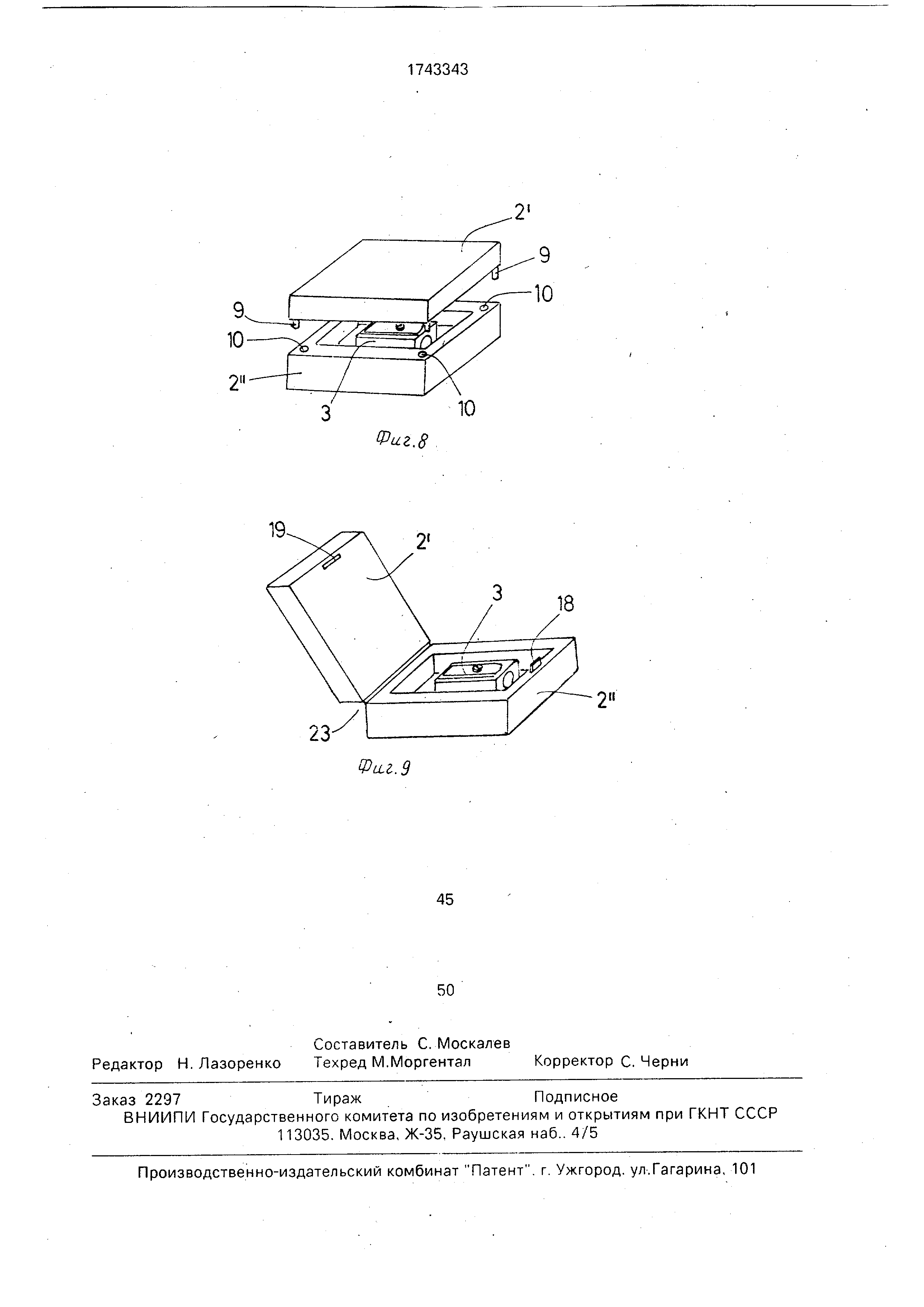 В вариантах исполнения, которые изображены на фиг.8 и 9 и в которых ластик 2 выполнен как футляр для точилки 3, верхняя пластина 2 либо просто поднимается целиком , а расположенная и закрепленная внутри точилка 3 может для работы целиком выниматься, либо соединена с нижней пластиной 2 пленочным шарниром 23.