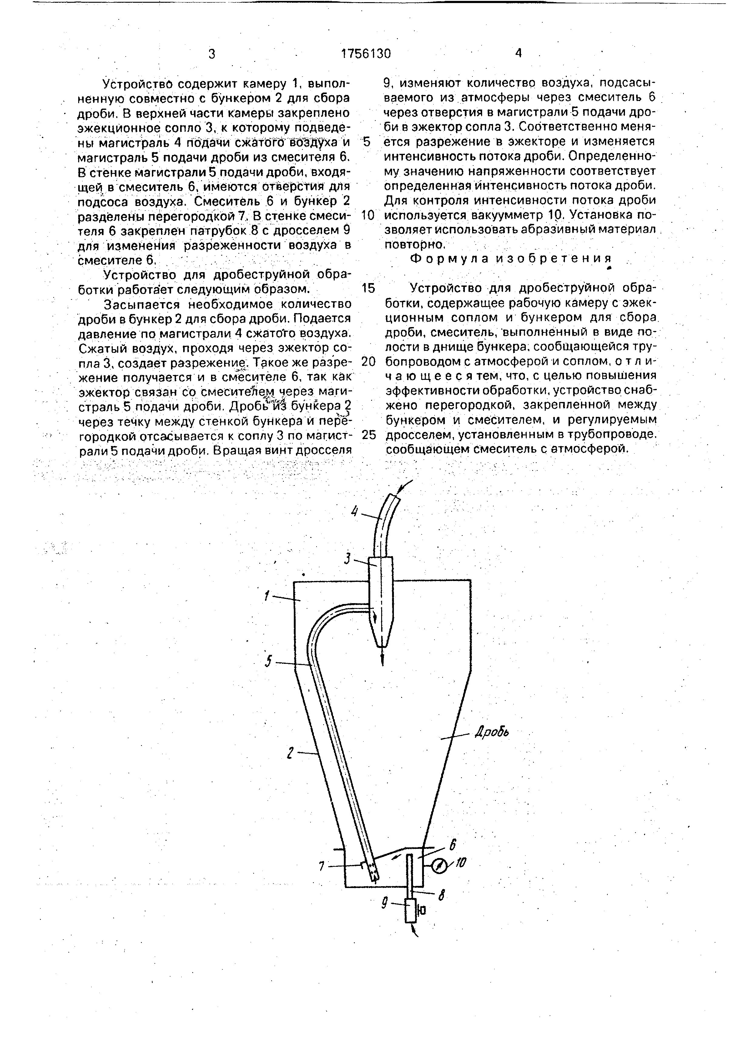 для изменения разреженности воздуха в смесителе 6. Устройство для дробеструйной обработки работает следующим образом. Засыпается необходимое количество дроби в бункер 2 для сбора дроби. Подается