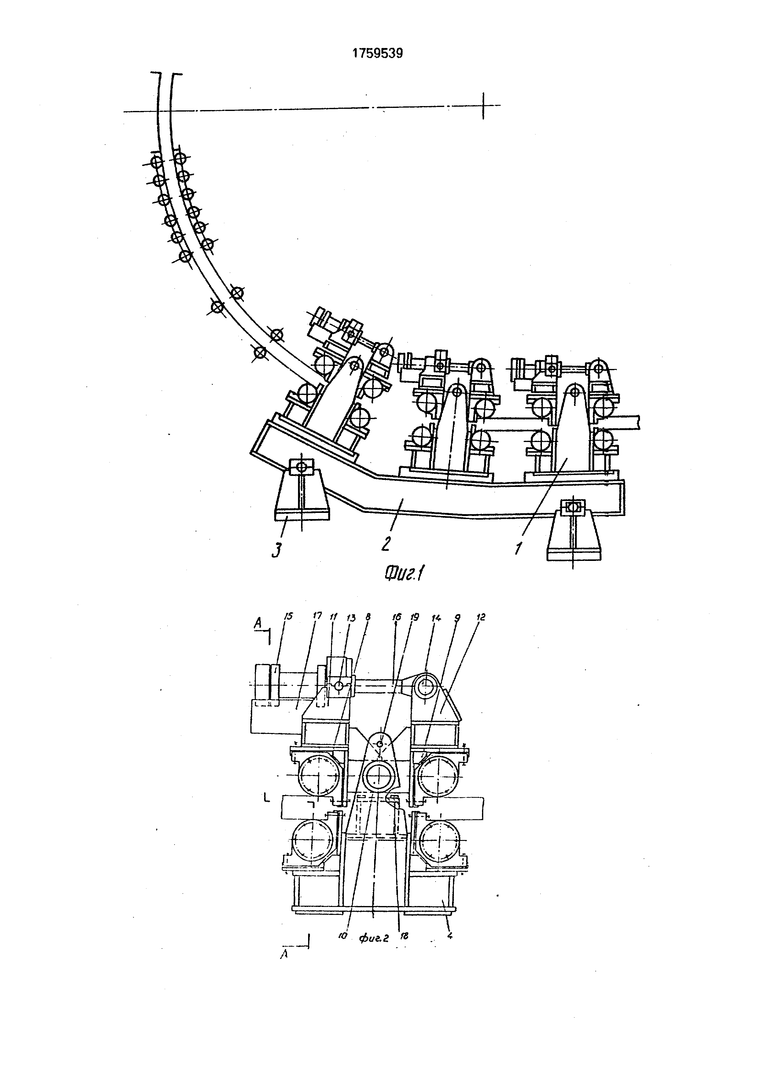 поднимаются до упора 19, который предохраняет пару верхних рычагов от завала в одну из сторон. В первую роликовую секцию заводят затравку (не показана). Подача затравки в