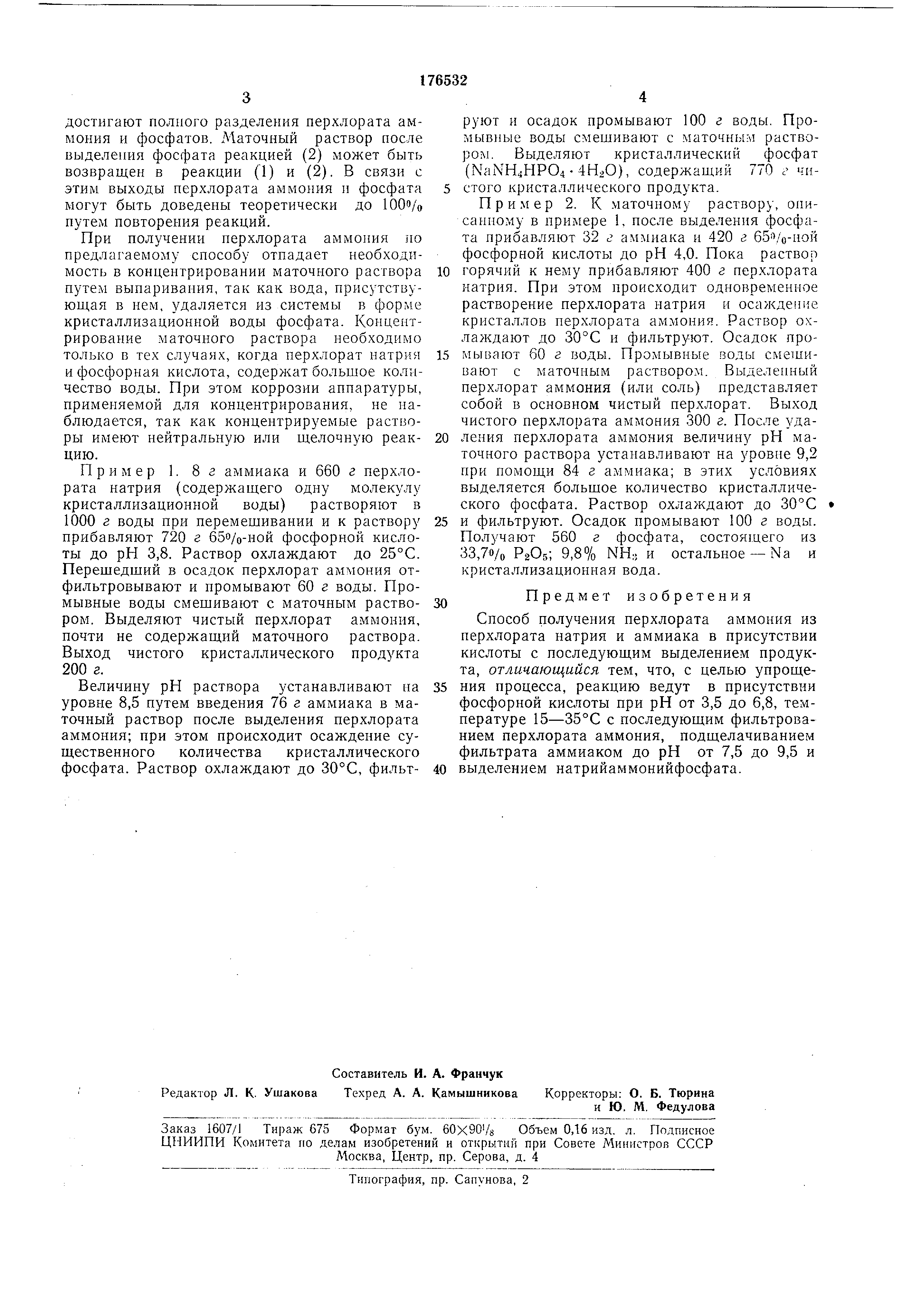 Пример 1. 8 г аммиака и 660 г перхлората натрия (содержащего одну молекулу кристаллизационной воды) растворяют в 1000 г воды при перемешивании и к раствору прибавляют 720 г 65о/о-ной фосфорной кислоты до рН 3,8. Раствор охлаждают до 25°С. Перешедший в осадок нерхлорат аммония отфильтровывают и промывают 60 г воды. Промывные воды смешивают с маточным раствором . Выделяют чистый перхлорат аммония, почти не содержащий маточного раствора. Выход чистого кристаллического продукта 200 г.
