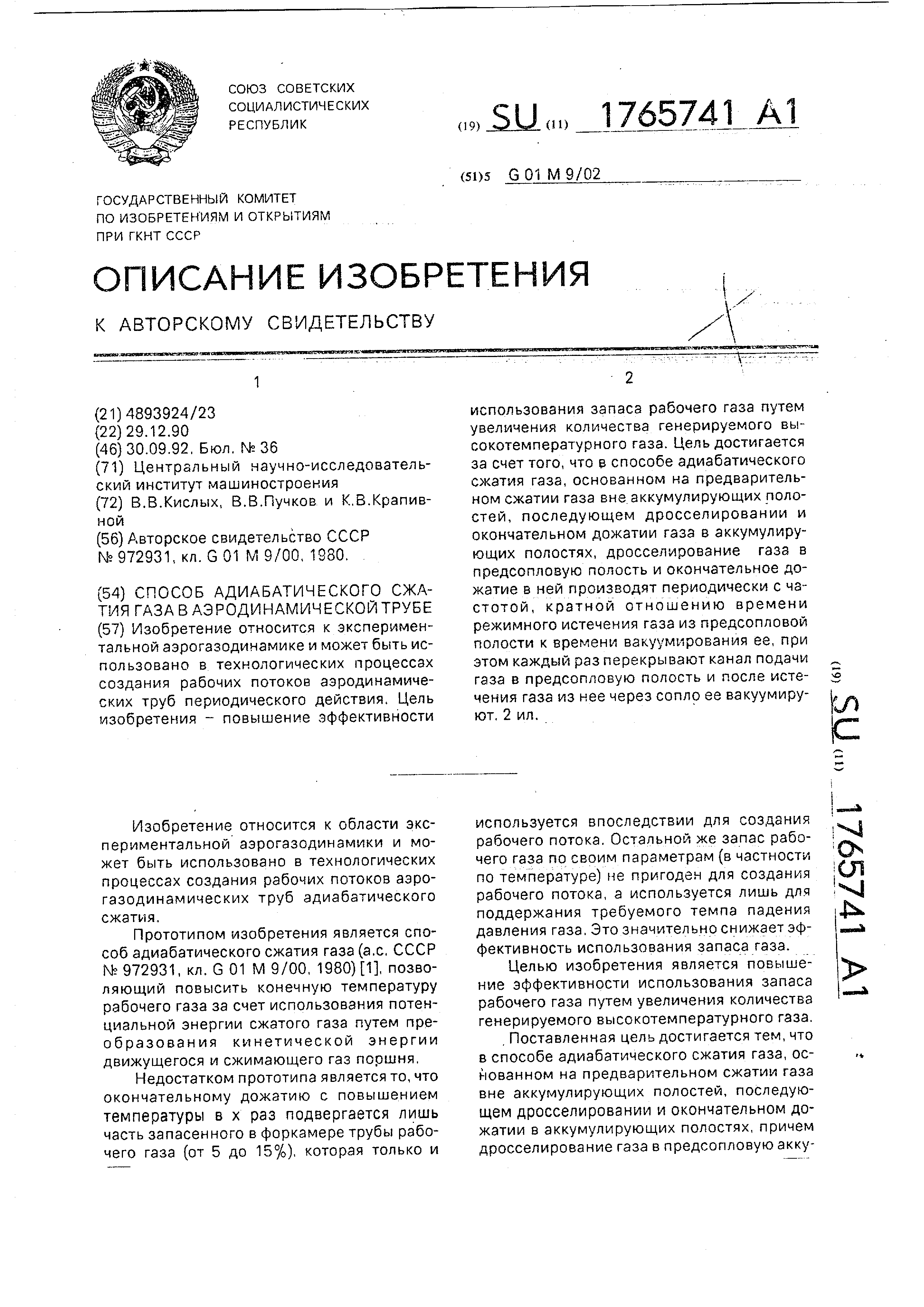 процессах создания рабочих потоков аэрогазодинамических труб адиабатического сжатия. Прототипом изобретения является способ адиабатического сжатия газа (а.с. СССР
