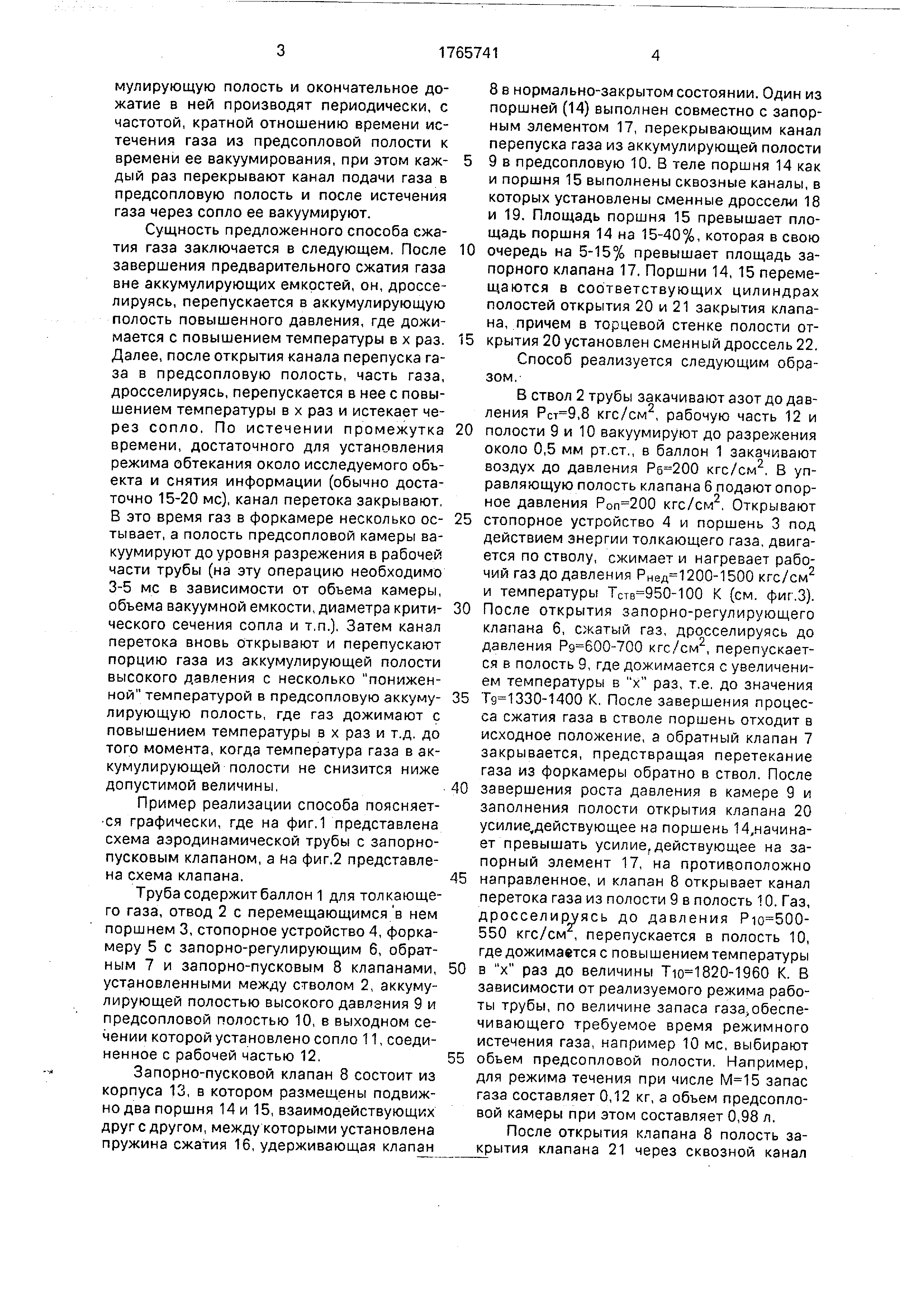 требуемого режима работы клапана 8, а следовательно , и всей трубы в целом. Формула изобретения Способ адиабатического сжатия газа в аэродинамической трубе, основанный на предварительном сжатии газа вне аккумулирующих