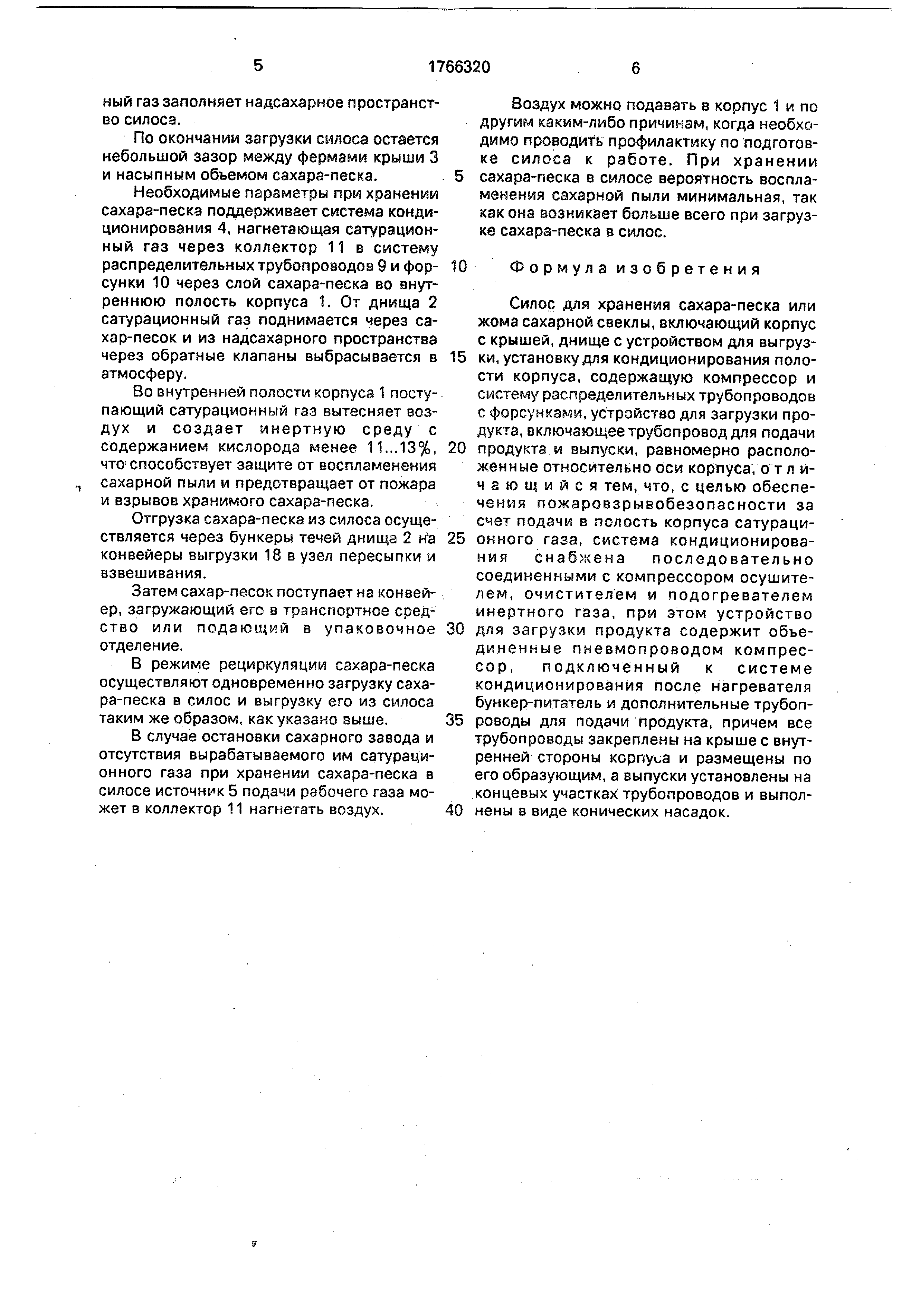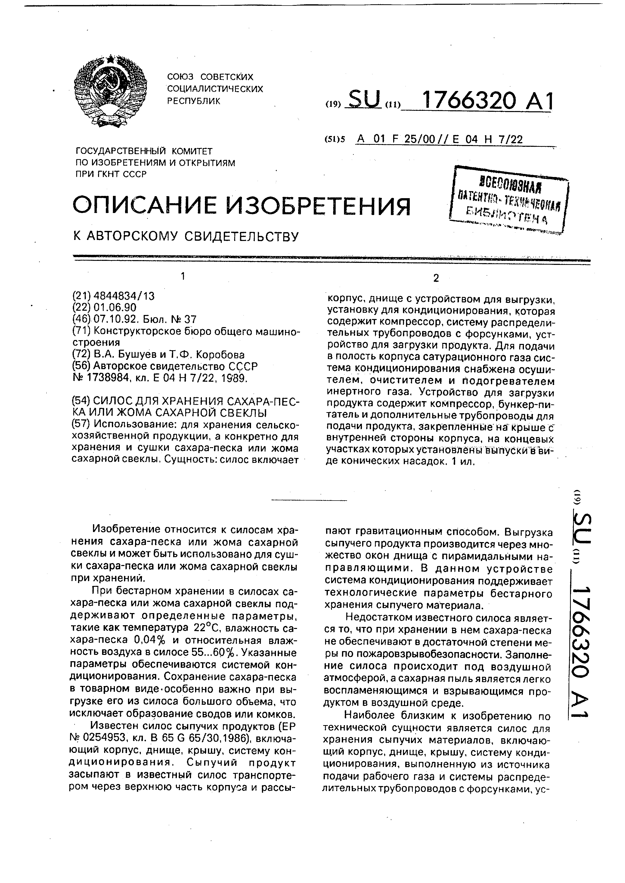 продукции, а конкретно для хранения и сушки сахара-песка или жома сахарной свеклы Сущность: силос включает корпус, днище с устройством для выгрузки, установку для кондиционирования, которая