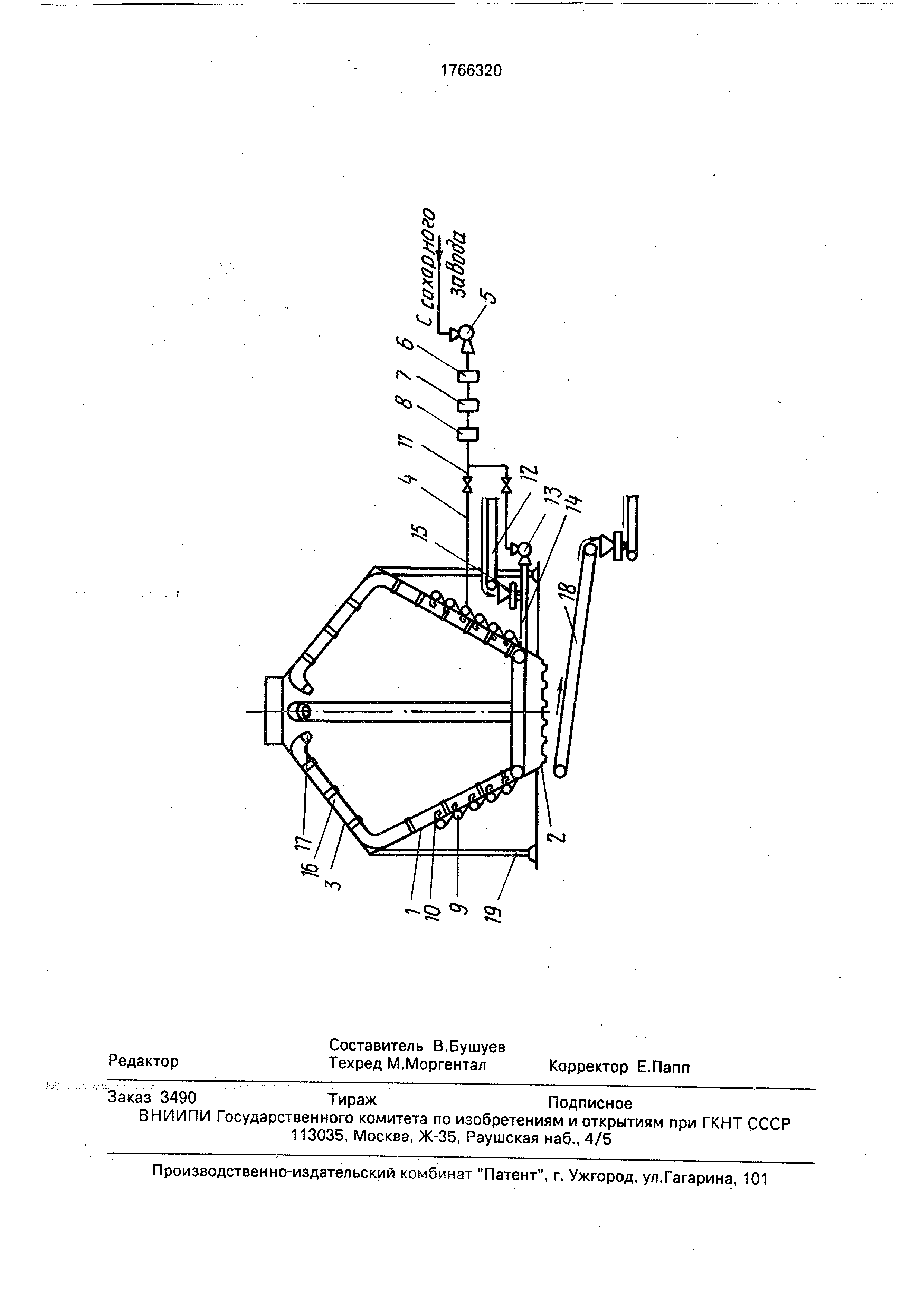 через выпуски 17 во внутреннюю, полость корпуса 1, Вместе с продуктом сатурационный газ заполняет надсахарное пространство силоса. По окончании загрузки силоса остается