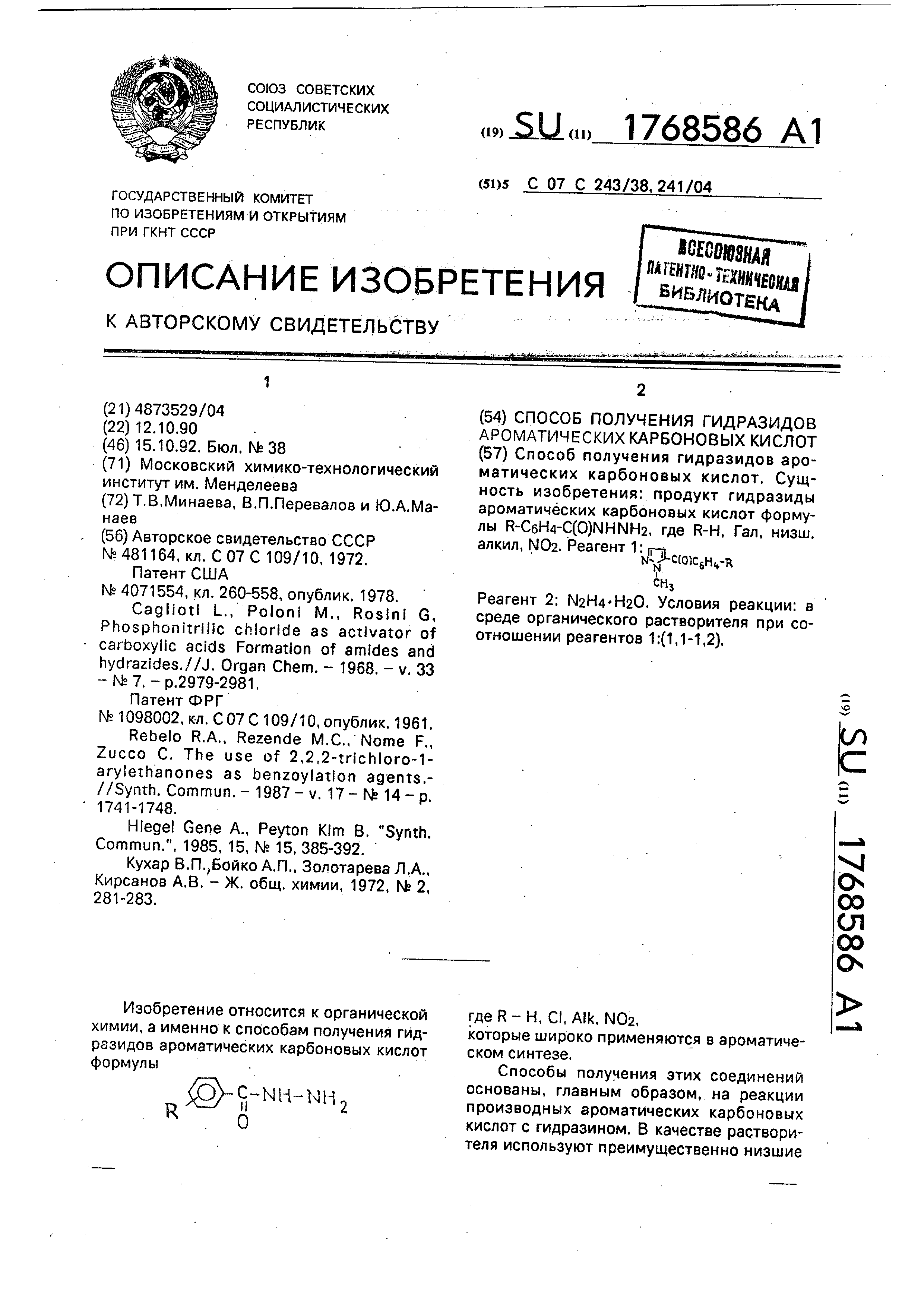 расхода гидразин-гидрата исключает необходимость его регенерации, что упрощает процесс. Формула изобретения Способ получения гидразидов ароматических
