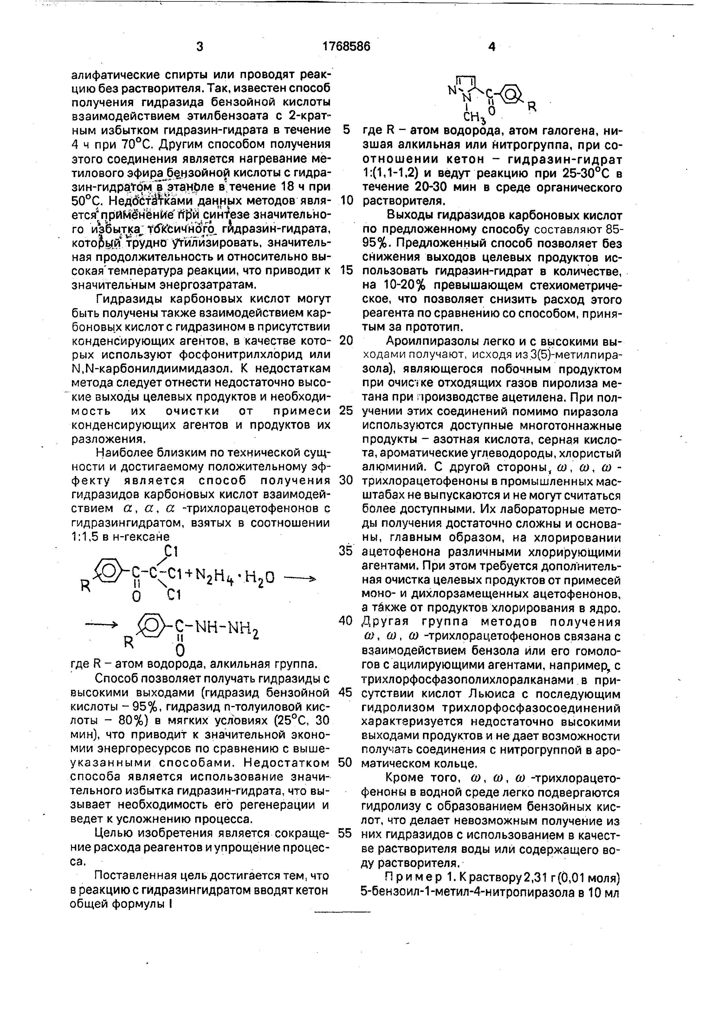 или без очистки от следов гидразин-гидрата использован для получения 4-нитро-1-метил пиразола. ПримерБ К раствору 2,76 г (0,01 моля) 1-метил-4-нитро-5-(3-нитробензоил)пиразо-