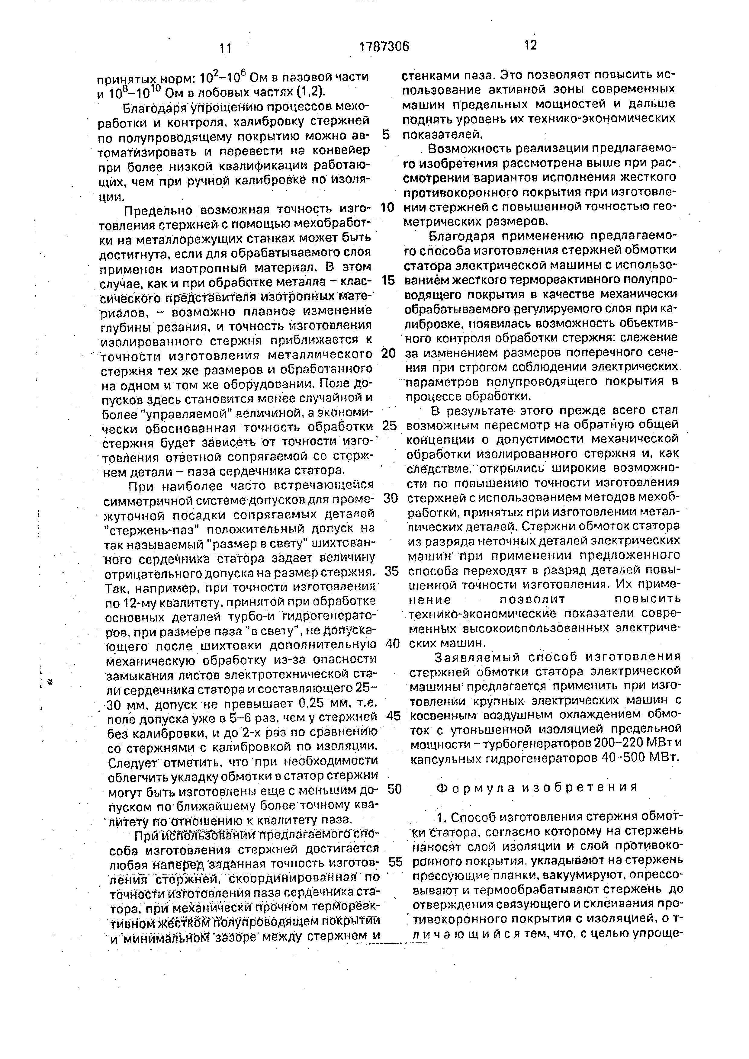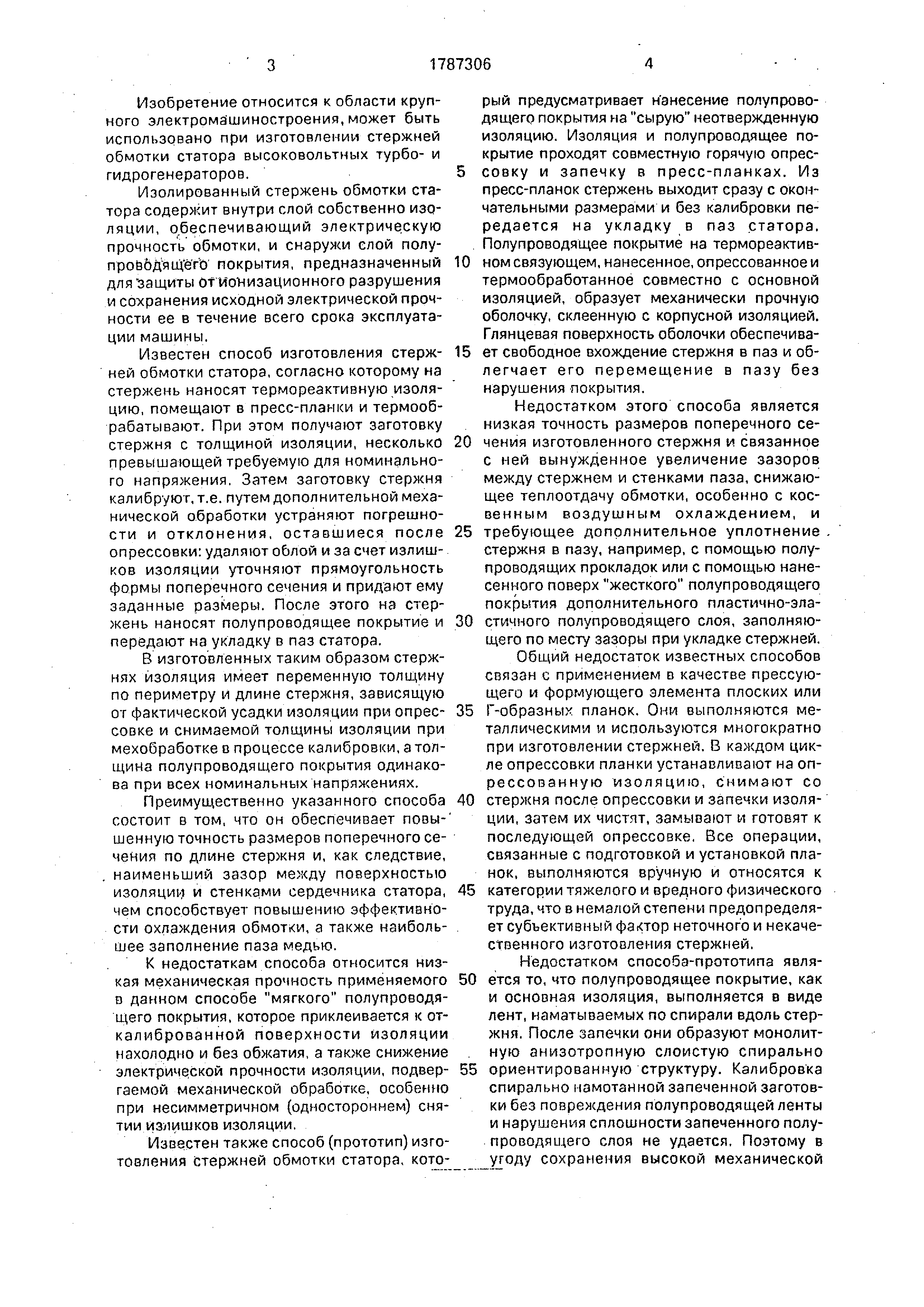 Известен также способ (прототип) изготовления стержней обмотки статора, который предусматривает н анесение полупроводящего покрытия на сырую неотвержденную изоляцию. Изоляция и по луп поводящее покрытие проходят совместную горячую опрессовку и запечку в пресс-планках. Из пресс-планок стержень выходит сразу с окончательными размерами и без калибровки передается на укладку в паз статора. Полупроводящее покрытие на термореактив0 ном связующем, нанесенное, спрессованное и термообработанное совместно с основной изоляцией, образует механически прочную оболочку, склеенную с корпусной изоляцией. Глянцевая поверхность оболочки обеспечива5 ет свободное вхождение стержня в паз и облегчает его перемещение в пазу без нарушения покрытия.
