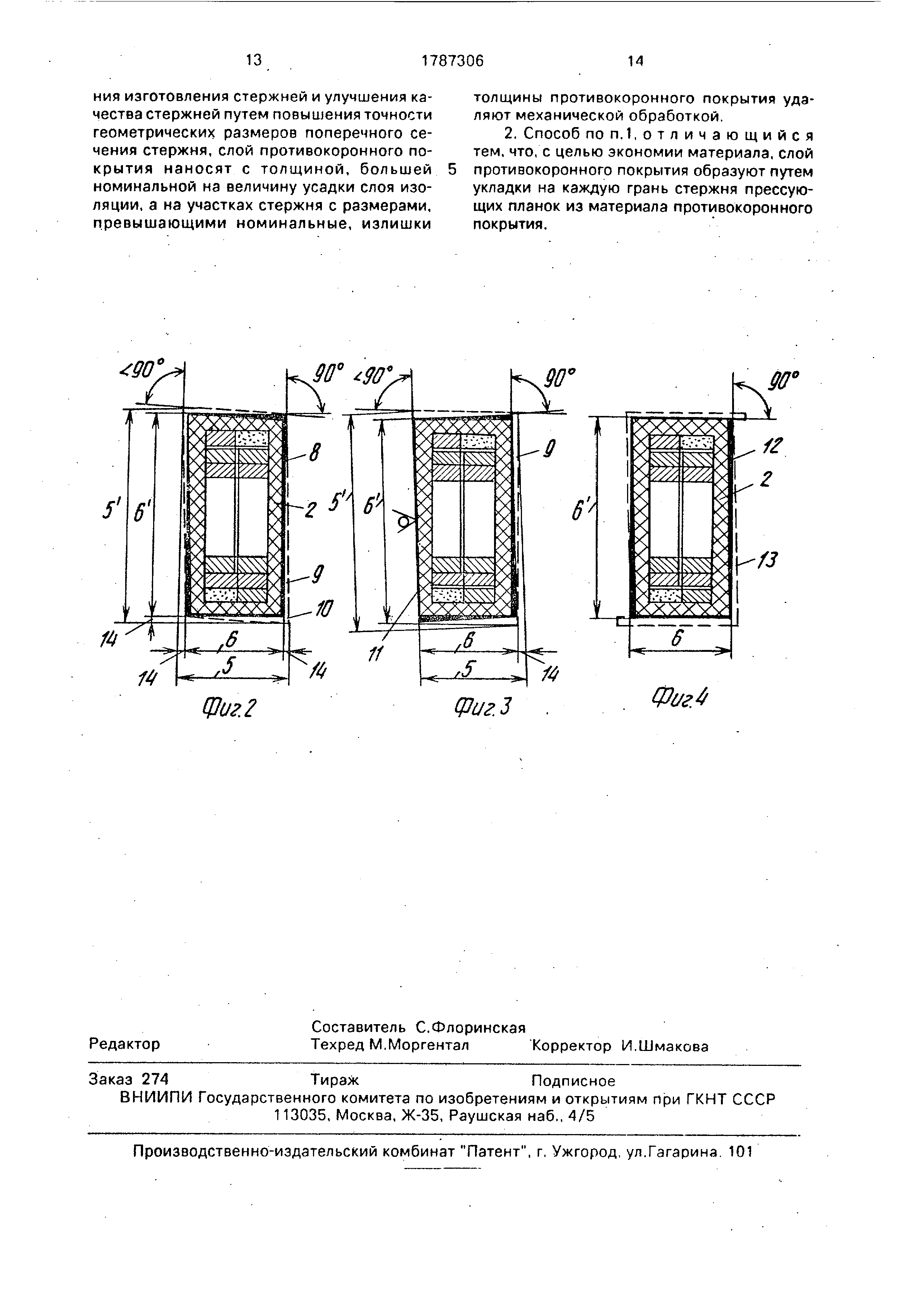 2. Способ по п. 1,отличающийся тем. что, с целью экономии материала, слой противокоронного покрытия образуют путем укладки на каждую грань стержня прессующих планок из материала противокоронного покрытия.