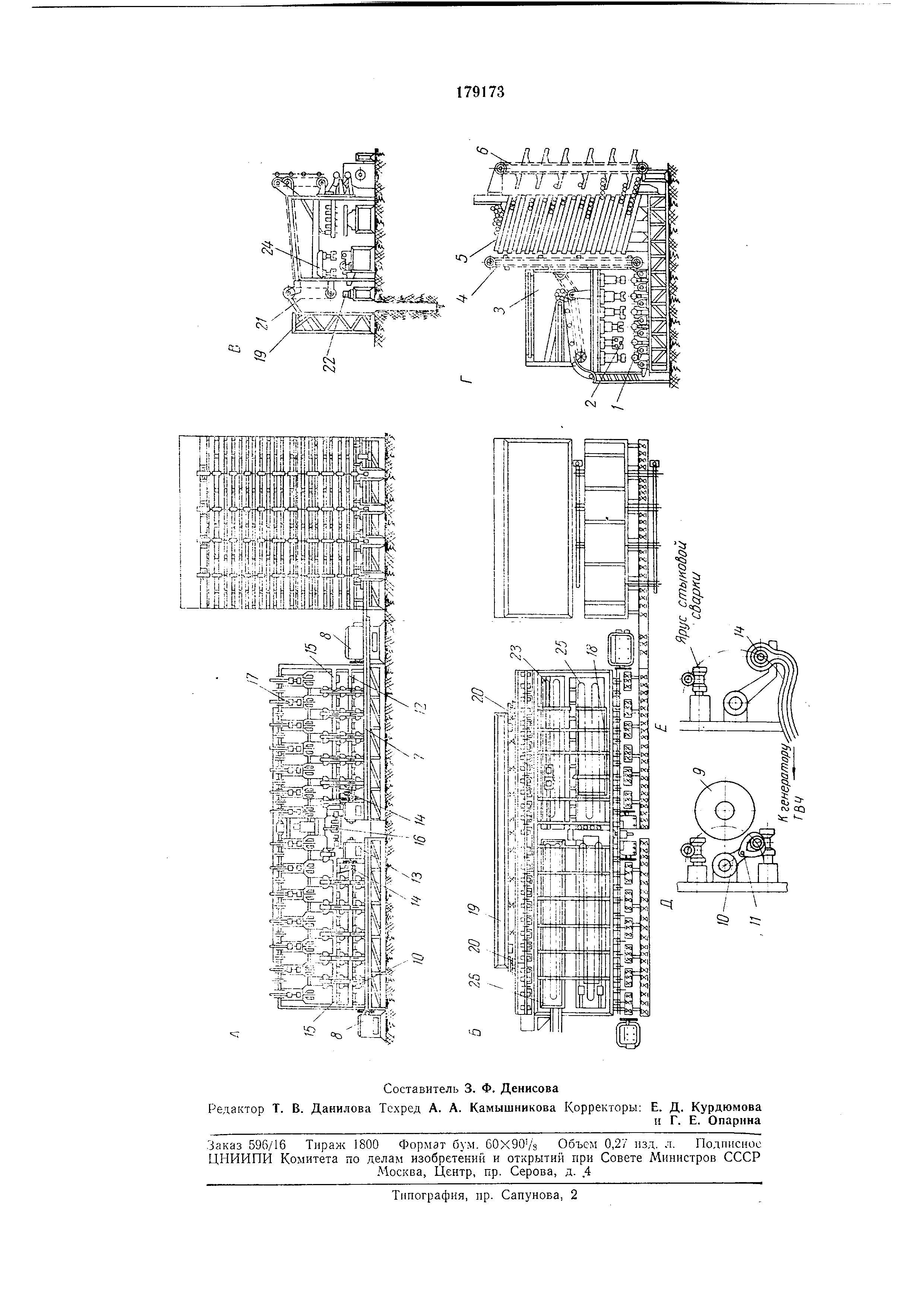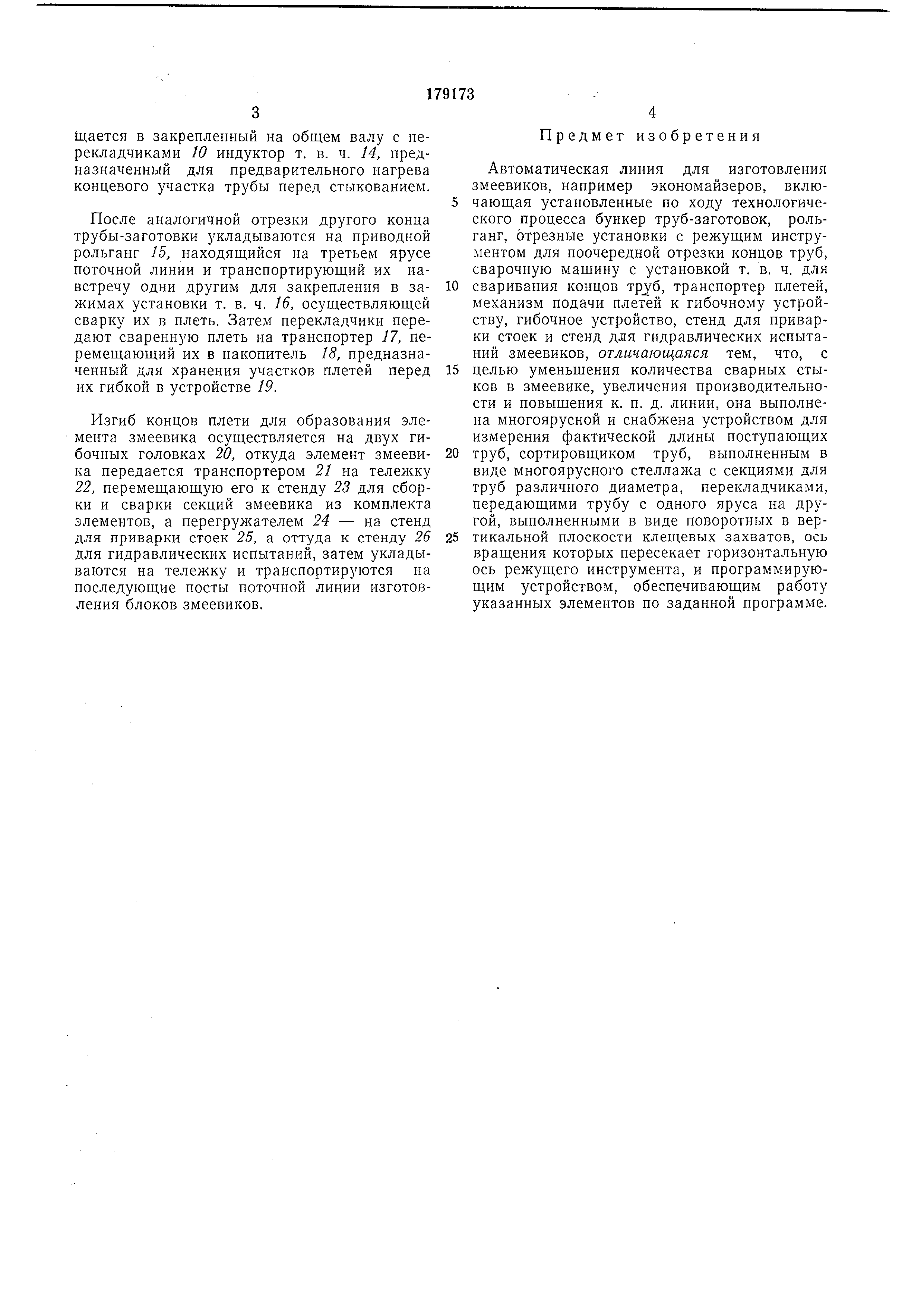 Изгиб концов плети для образования элемента змеевика осуществляется на двух гибочных головках 20, откуда элемент змеевика передается транспортером 21 на тележку 22, перемещающую его к стенду 23 для сборки и сварки секций змеевика из комплекта элементов, а перегружателем 24 - на стенд для приварки стоек 25, а оттуда к стенду 26 для гидравлических испытаний, затем укладываются на тележку и транспортируются на последующие посты поточной линии изготовления блоков змеевиков.