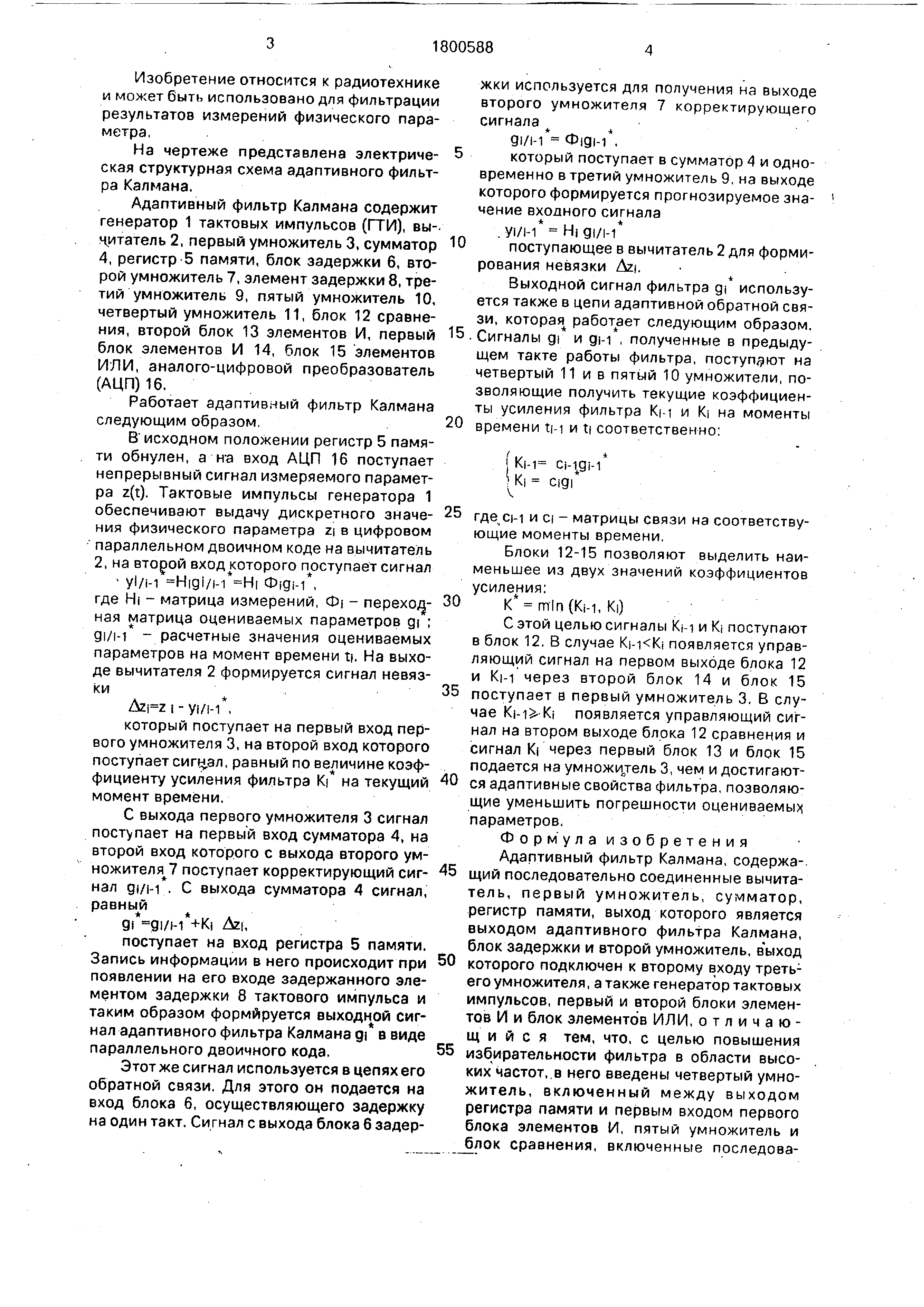 адаптивные свойства фильтра, позволяющие уменьшить погрешности оцениваемых параметров. Фор мула изобретения Адаптивный фильтр Калмана, содержащий
