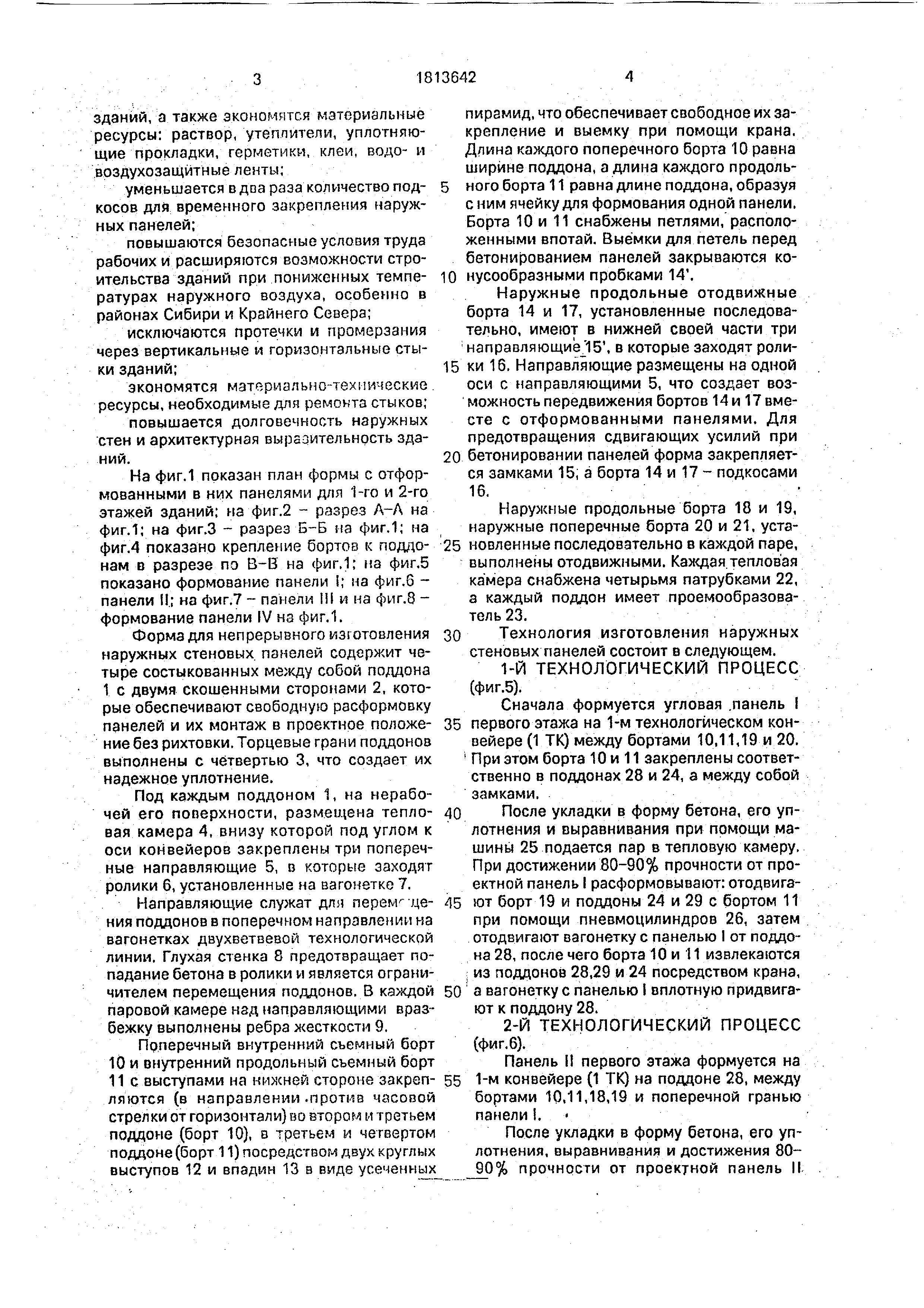 зданий при пониженных температурах наружного воздуха, особенно в районах Сибири и Крайнего Севера; исключаются протечки и промерзания через вертикальные и горизонтальные стыки зданий; экономятся материально-технические. ресурсы, необходимые для ремонта стыков; повышается долговечность наружных стен и архитектурная выразительность зданий . На фиг.1 показан план формы с отформованными в них панелями для 1-го и 2-го