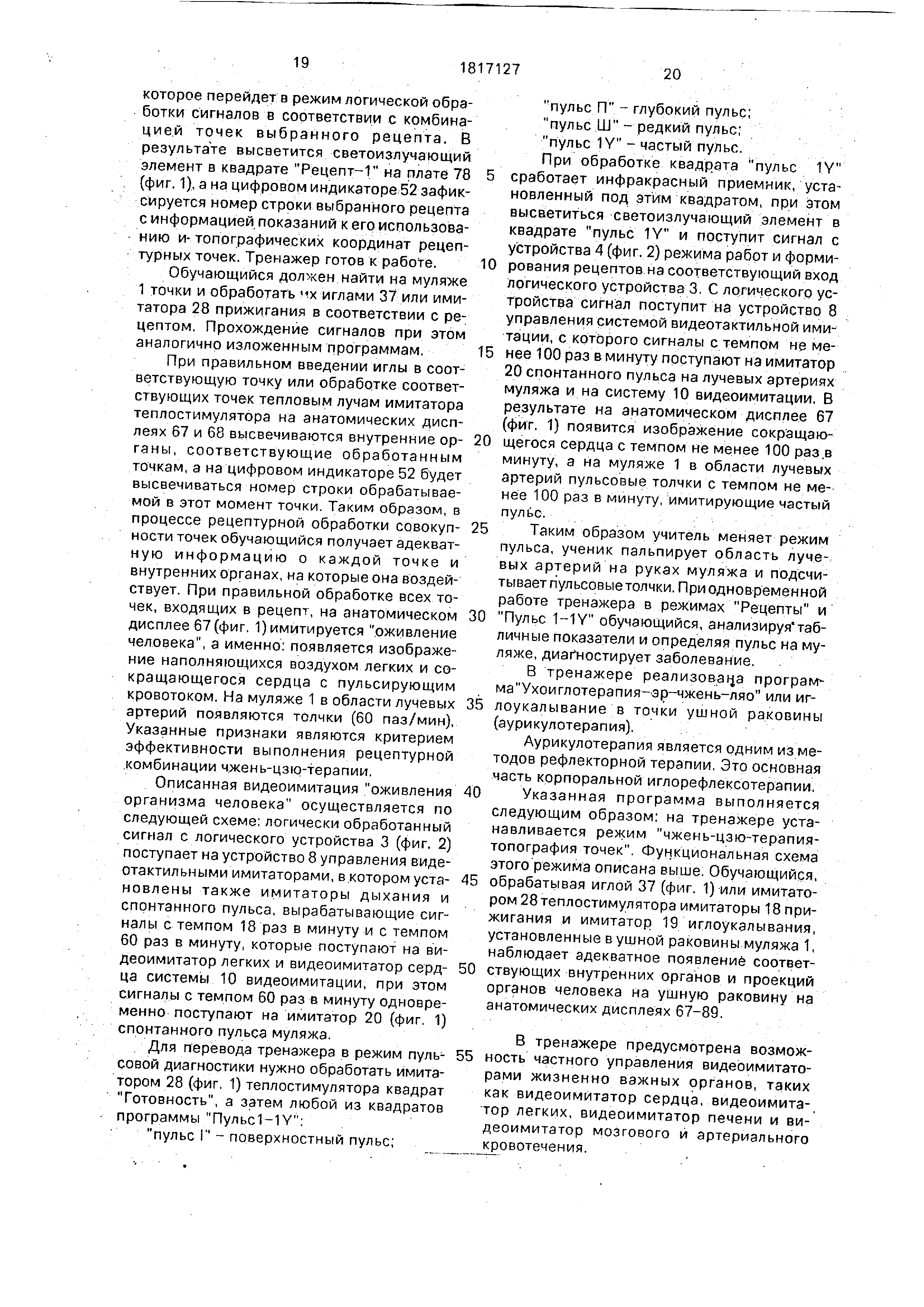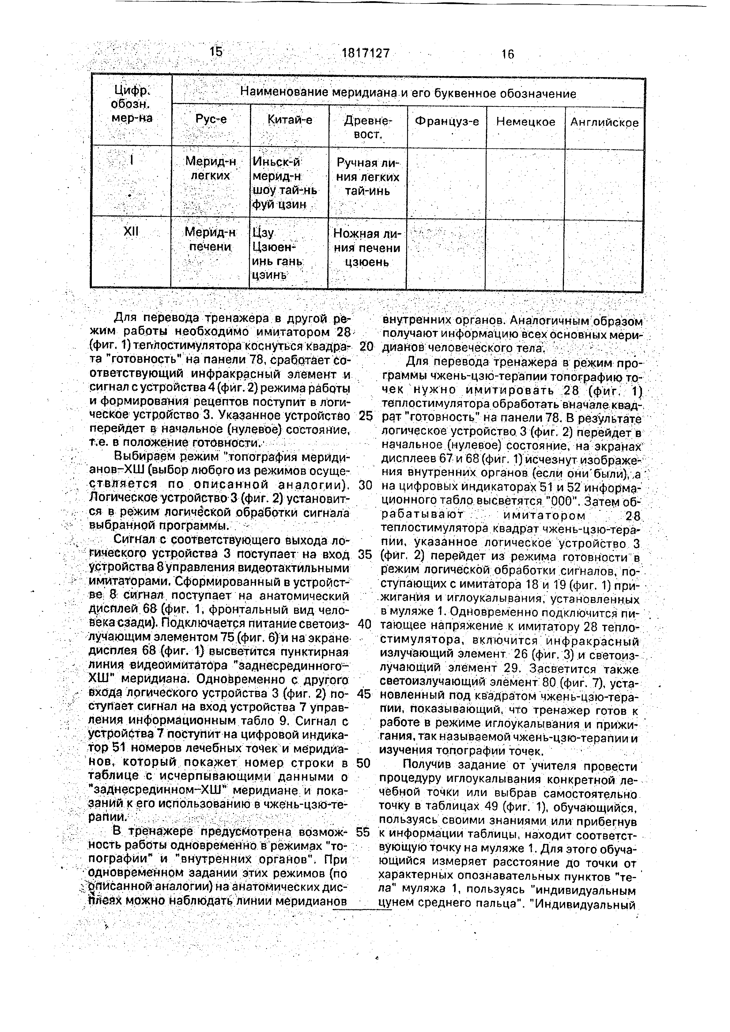 расположения акупуиктурных точек, а блок шеи и блоки верхних и нижних конечностей дополнительно снабжены имитаторами пульсовых толчков, в тренажер введены система