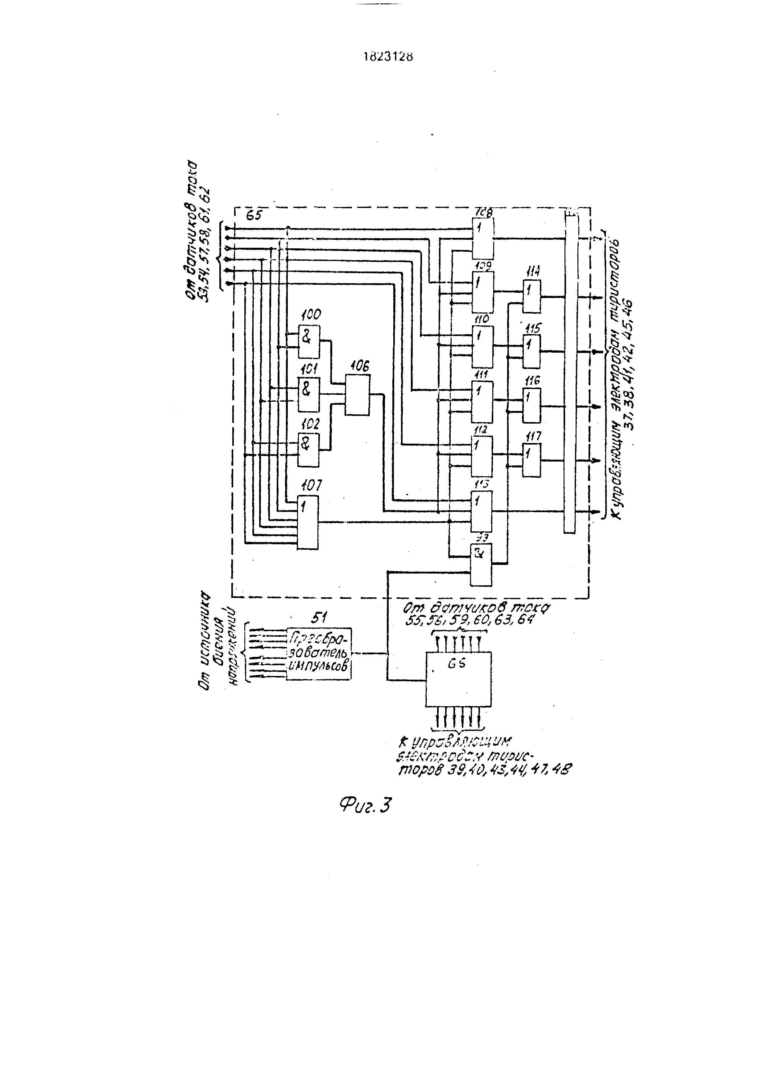 блок 66, обеспечивая появление управляющих сигналов на тиристорах 40, 43, 44, 47.