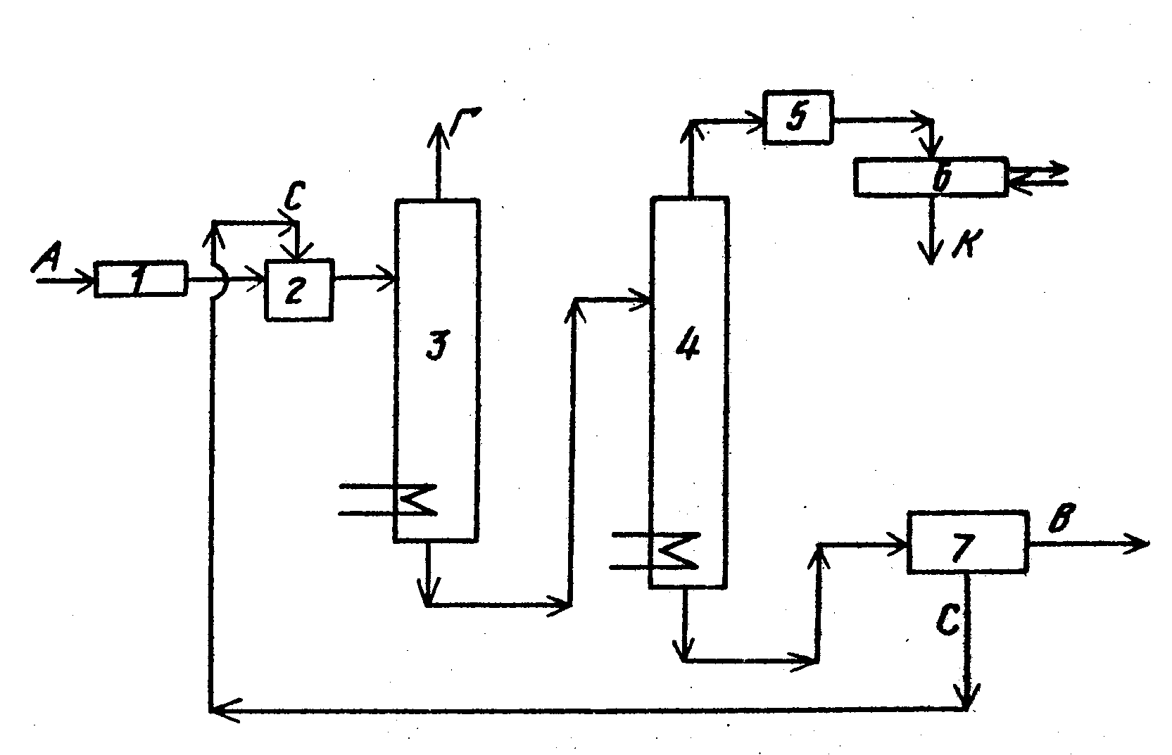 р со Изобретение относится к коксохимическому производству, а именно к переработке аммиаксодержащих абсорбционных вод (А) коксохимического производства. Цель изобретения - снижение расхода щелочи на промывку за счет повышения селективности разделения аммиака и кислых компонентов. Для переработки А в них предварительно вводят нелетучие соли аммония в количестве 100-300 г/дм3, отгоняют кислые компоненты, а затем отгоняют пары аммиака. Последние подвергают щелочной промывке для удаления остатков кислых компонентов. После промывки пары аммиака конденсируют и получают концентрированную аммиачную воду. В процессе можно использовать любые нелетучие соли аммония, однако наиболее экономичным является применение отходов коксохимического производства, содержащих хлорид, роданид, сульфат и тиосульфат аммония. Селективность процесса разделения аммиака и кислых компонентов определяется фазовыми распределениями в системе аммиачный раствор - пар. Для системы H20-NH3- H2S-HCN-C02 невозможно достичь высокой селективности разделения аммиака и кислых компонентов без применения диссоциаторов, работающих при высоких давлениях и температурах. Экспериментально установлено, что нелетучие соли аммония или их смеси при концентрации не менее 100 г/дм обладают высаливающим действием по отношению к летучим компонентам коксового газа. Особенно оно проявляется к H2S и С02, что позволяет повысить селективность процесса отгонки кислых компонентов из А и существенно снизить расход щелочи при последующей очистке аммиачных паров перед их конденсацией. Верхний предел концентрации нелетучих солей аммония 300 г/дм3 установлен, исходя из растворимости этих солей и опыта экспериментальных исследований во избежание образования инкрустаций и отложений солей в оборудовании . В табл. 1, например, показана зависимость равновесных концентраций комФОРМУЛА ИЗОБРЕТЕНИЯ 1. Способ получения концентрированной аммиачной воды из аммиаксодержащих абсорбционных вод коксохимического производства , включающий отгонку кислых компонентов , последующую отгонку водяным паром паров аммиака, их щелочную промывку и конденсацию, отличающийся тем, понентов коксового газа от содержания в растворе NH4CI, NH4CNS и их смесей. Пример. Принципиальная технологическая схема процесса переработки аммиаксодержащих абсорбционных вод коксохимического производства показана на чертеже. Абсорбционные воды после предварительного подогрева в теплообменнике 1 перемешиваются в реакторе 2 с раствором нелетучей аммонийной соли (С) до концентрации последней 100-300 г/дм и подаются в диссоциатор 3, где при помощи острого и (или) глухого пара отдуваются кислые компоненты. Аммиачная вода из диссоциа- тора 3 подается в дистилляционную колонну 4, в которой острыми (или) глухим паром отдуваются пары аммиака. В промывателе 5 они отмываются щелочью от остатков кислых примесей и в конденсаторе 6 охлаждаются с получением конденсата - концентрированной аммиачной воды (К), не содержащей сероводорода и углекислоты. Очищенная аммиачная вода из дистилляционной колонны подается в вакуум-выпарной агрегат 7 для концентрирования солей. Концентрированный солевой раствор (С) возвращается для смешивания с А, а вода, не содержащая солей (В), из агрегата 7 направляется на дальнейшую очистку. Сероводородный газ (Г), образовавшийся 
