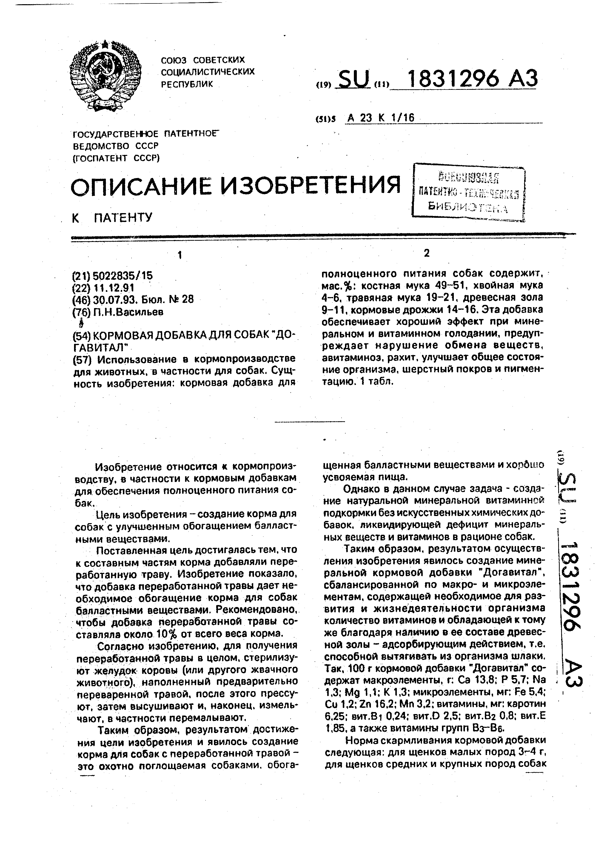 Использование в кормопроизводстве для животных, в частности для собак. Сущность изобретения: кормовая добавка для полноценного питания собак содержит, мас.%: костная мука 49-51, хвойная мука 4-6, травяная мука 19-21, древесная зола 9-11, кормовые дрожжи 14-16. Эта добавка обеспечивает хороший эффект при минеральном и витаминном голодании, предупреждает нарушение обмена веществ, авитаминоз, рахит, улучшает общее состояние организма, шерстный покров и пигментацию . 1 табл.