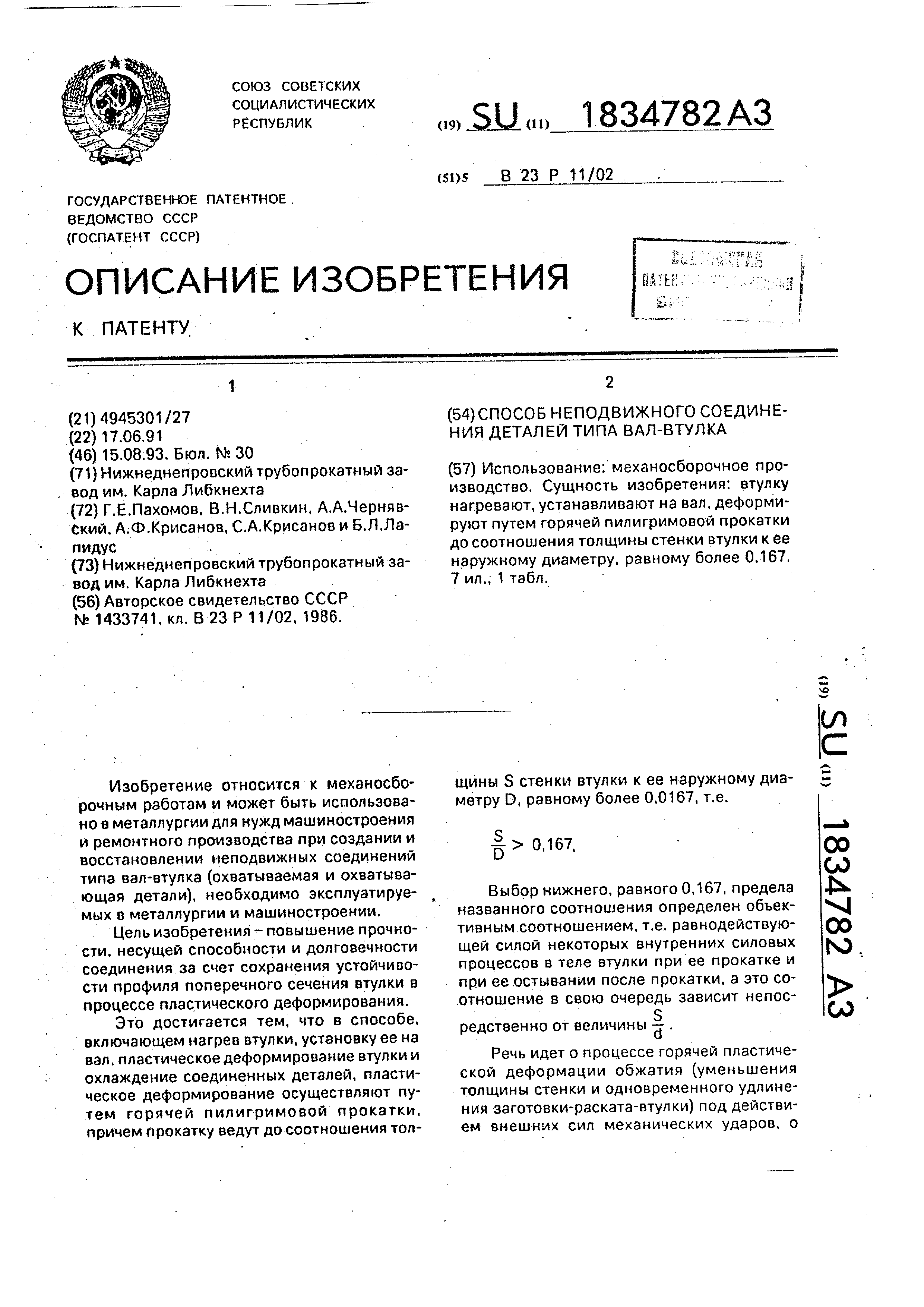 Выбор нижнего, равного 0,167, предела названного соотношения определен объективным соотношением, т.е. равнодействующей силой некоторых внутренних силовых процессов в теле втулки при ее прокатке и при ее остывании после прокатки, а это со- .отношение в свою очередь зависит непосS редственно от величины - .