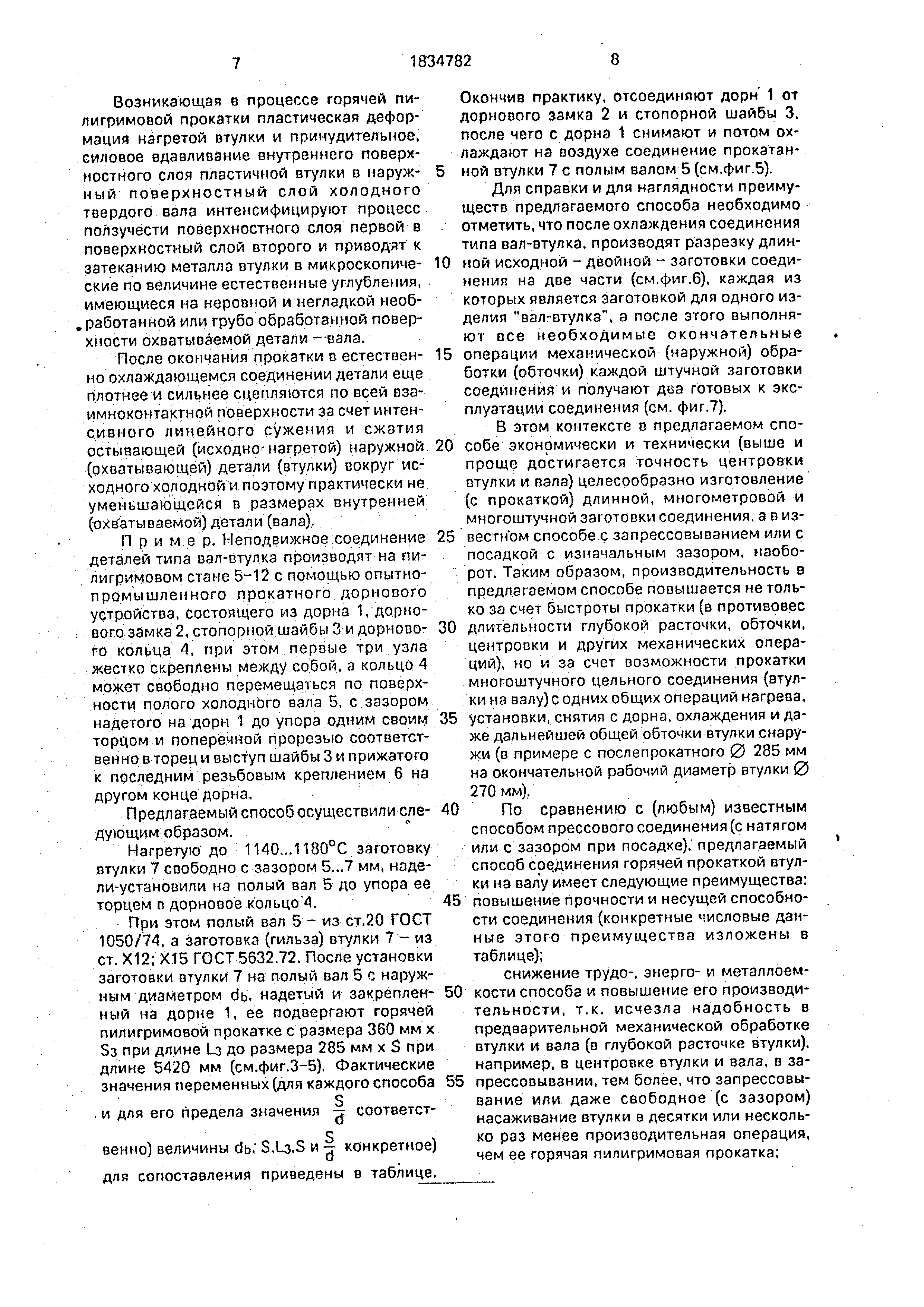на производство ненадежных, недолговечных неподвижных соединений вала и втулки ), т.к. известный способ не устанавливает (для гарантированной прочности и долговечности соединений) конкретного оптимального диапазона величин соотношения этих параметров - толщины S стенки втулки к ее наружному диаметру D, то изобретение такой диапазон устанавливает (для процес0 са прокатки) в его естественной причинно- следственной связи с физическими свойствами и особенностями процесса прокатки и остывания после нее и тем самым достирает сохранения указанной устойчиво5 сти без овализации втулки, обеспечивая плотное беззазорное зажатие-охватывание (прилегание) вала втулкой сплошь по всей их контактной поверхности и соответственно прочное сцепление их сопрягающихся сло0 ев со всеми вытекающими отсюда преимуществами .