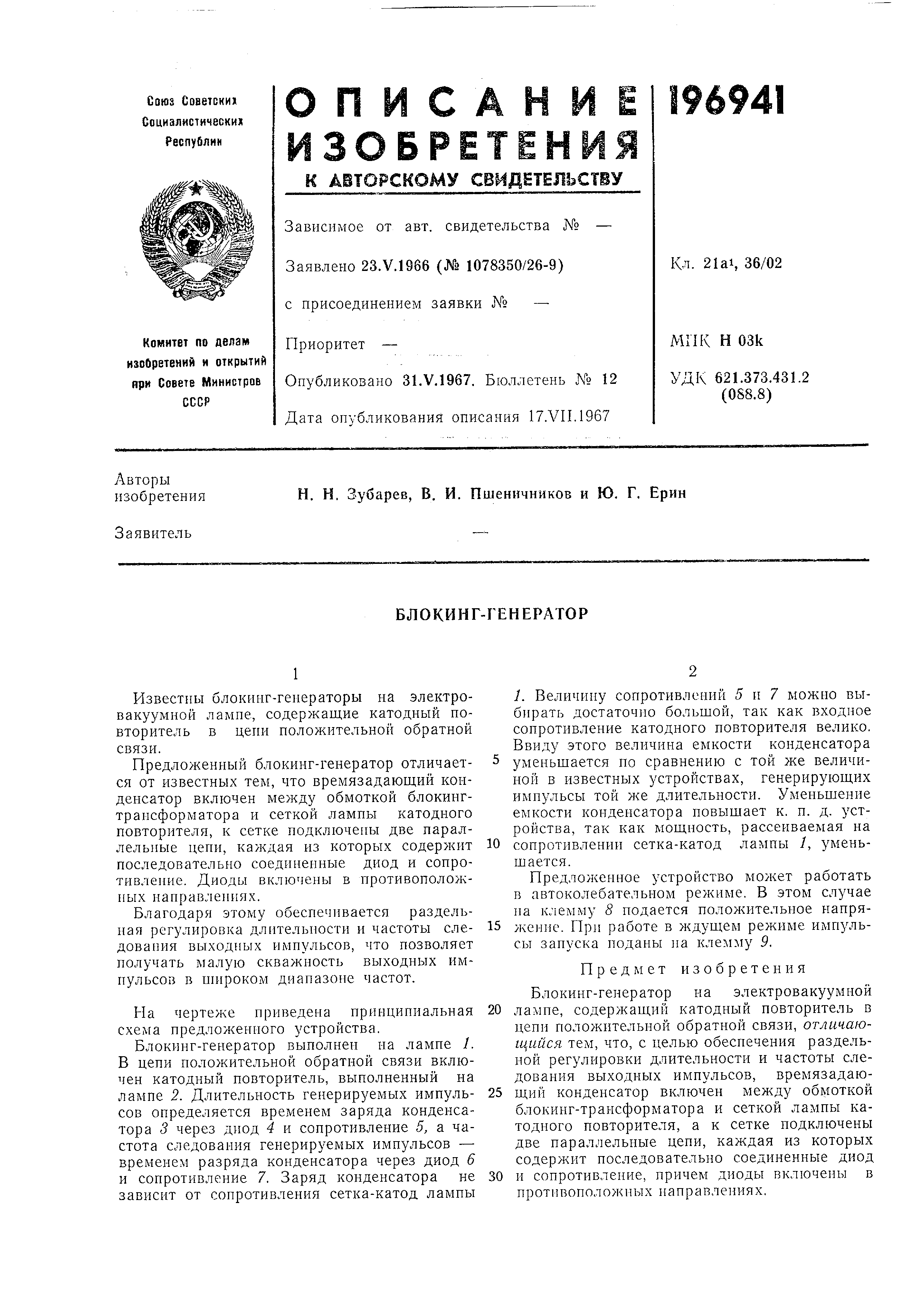 Блокинг-генератор на электровакуумной 0 лампе, содержащий катодный повторитель в цепи положнтельпой обратной связи, отличающийся тем, что, с целью обеснечения раздельной регулировки длительности и частоты следования выходных имнульсов, времязадаю5 щий конденсатор включен мелсду обмоткой блокинг-трансформатора и сеткой лампы катодного повторителя, а к сетке нодключены две параллельные цепи, каждая из которых содержит последовательно соединенные диод 0 и сопротивление, причем диоды включены в противоположных направлениях.