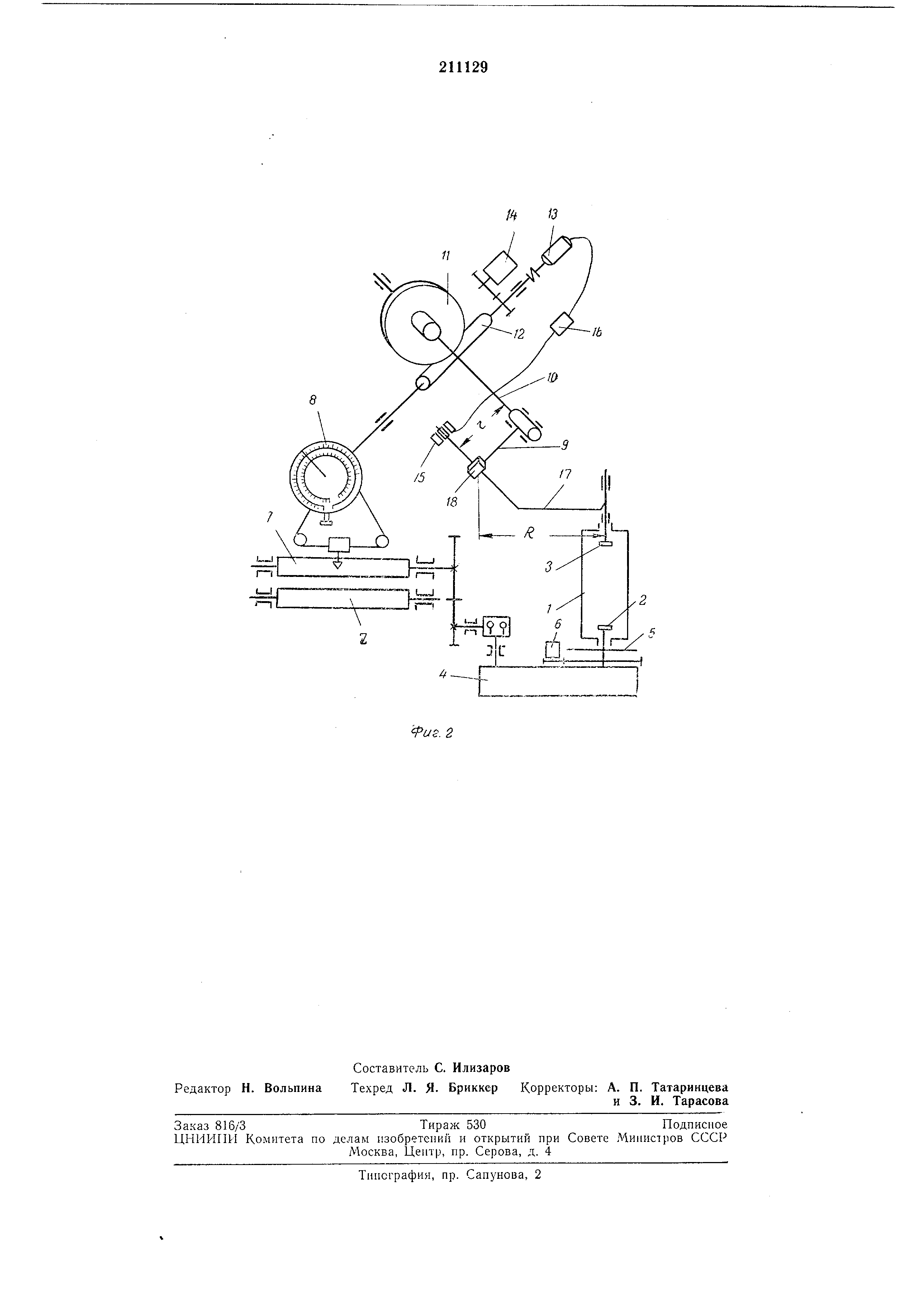 ного с червячным колесом //, находящимся в зацеплении с червяком 12, один конец вала которого связан со стрелкой шкалы 8 и нером диаграммного аппарата 7, а другой - с электроприводом нагружения 13. При помощи контактного устройства 14 при перегрузке или разрушении образца, выключаетсяэлектропривод , сигнал к которому подается от датчика 15 через усилитель 16.