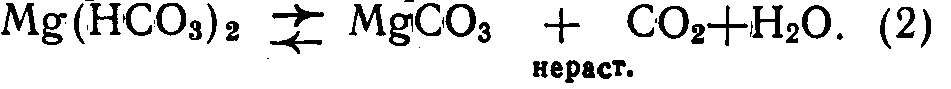 Изобретение относится к области получения карбонатов магния из гидроокиси магния. Известен способ получения растворов бикарбоната магния карбонизацией суспензии гидроокиси магния при температуре не выше 26°С. Этот способ ведут в две стадии, получая на первой стадии - карбонат магния, на второй - бикарбонат. Процесс проходит при давлении углекислоты 2,5-3 атм. Предлагаемый способ отличается от известного тем, что карбонизацию осуществляют разбрызгиванием суспензии гидроокиси магния в атмосфере углекислоты при атмосферном давлении со скоростью, обеспечивающей поддержание рН раствора не выше 8,4. Это упрощает технологию процесса карбонизации, так как его осуществляют в одну стадию, интенсифицирует процесс и позволяет получить более чистый раствор бикарбоната. Опытами установлено, что рН раствора при постоянной температуре в основном зависит от скорости абсорбции СО2 суспензией Mg(OH)2, т.е. от коэффициента абсорбции Kυ, отнесенного к 1 м3 карбонизатора в час при атмосферном давлении. При Кυ<40 кг СО2/м3·час·атм рН>8,4 часть образовавшегося Mg(НСО3)2 превращается в MgCO3 по реакции При Kυ>40 кг СО2/м3·час·атм рН<8,4, если начальная концентрация Mg(OH)2 не превышает максимальной растворимости образовавшегося Mg(HCO3)2 при конечной температуре. После завершения карбонизации раствор имеет рН≈7,2 и при применении чистой Mg(OH)2 прозрачен. Если начальная концентрация Mg(OH)2превышает максимальную растворимость полученного Mg(HCO3)2, то часть последнего будет разлагаться по реакции Оптимальный режим карбонизации контролируется интенсивностью разбрызгивания, при которой Kυ>40 кг СО2/м3·час·атм, начальной концентрацией Mg(OH)2, поступающей в карбонизатор, температурой в карбонизаторе и скоростью подачи СО2. Для непрерывного получения раствора Mg(HCO3)2 одностадийной карбонизацией при атмосферном давлении используют горизонтальный цилиндрический абсорбционный аппарат с S-образными разбрызгивателями; В таком аппарате проводят процесс карбонизации при Kυ=120-160 кг CO2/м3∙час·атм, т.е. в условиях, при которых исключено образование карбоната магния по реакции (I). Пример. При интенсивном разбрызгивании гидроокиси магния с содержанием в ней 25 г/л MgO в атмосфере углекислоты рН раствора не превышает 8,4. Растворы бикарбоната магния, полученные в одну стадию при атмосферном давлении, в зависимости от температуры содержат следующее количество MgO (в г/л): 22°С 21,1; 21°С 22,6; 20,5°С 23,5; 18°С 25,1. Переход карбоната магния в жидкую фазу по реакции (I) исключен, поэтому можно получать более чистые растворы и, следовательно, более чистые сорта магнезий..