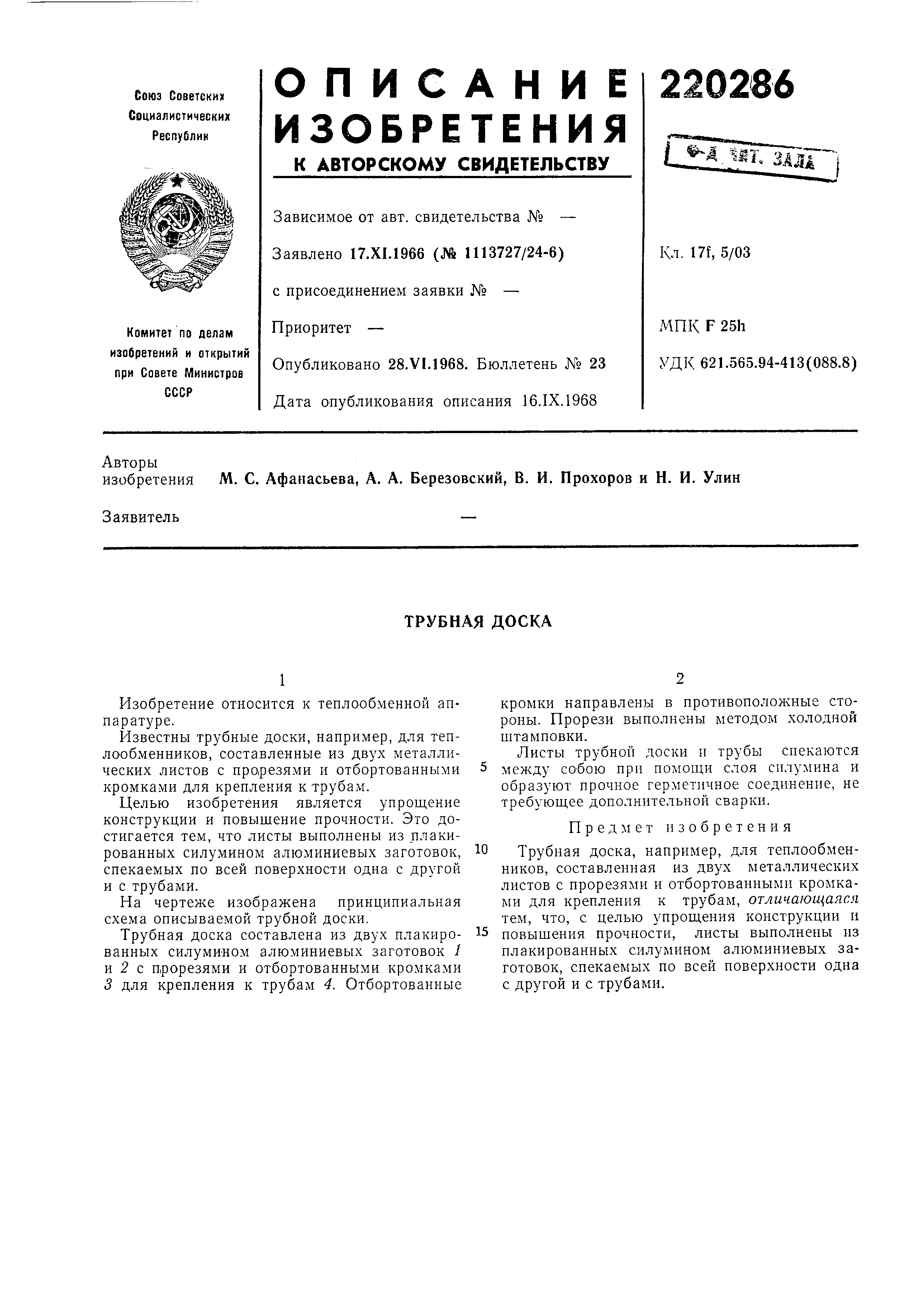 Листы трубной доски и трубы спекаются между собою при помош,и слоя силумина и образуют прочное герметичное соединение, не требуюшее дополнительной сварки.