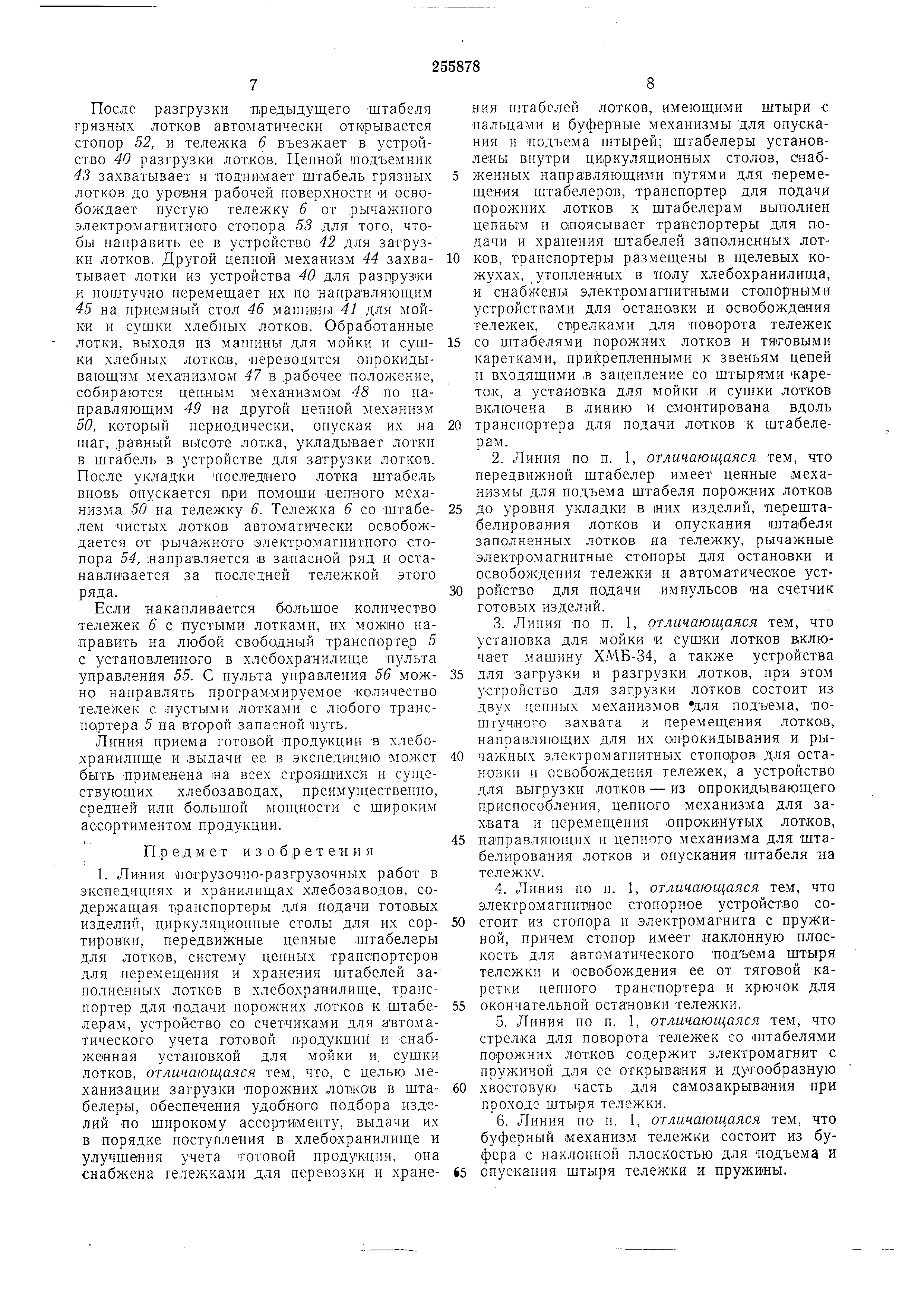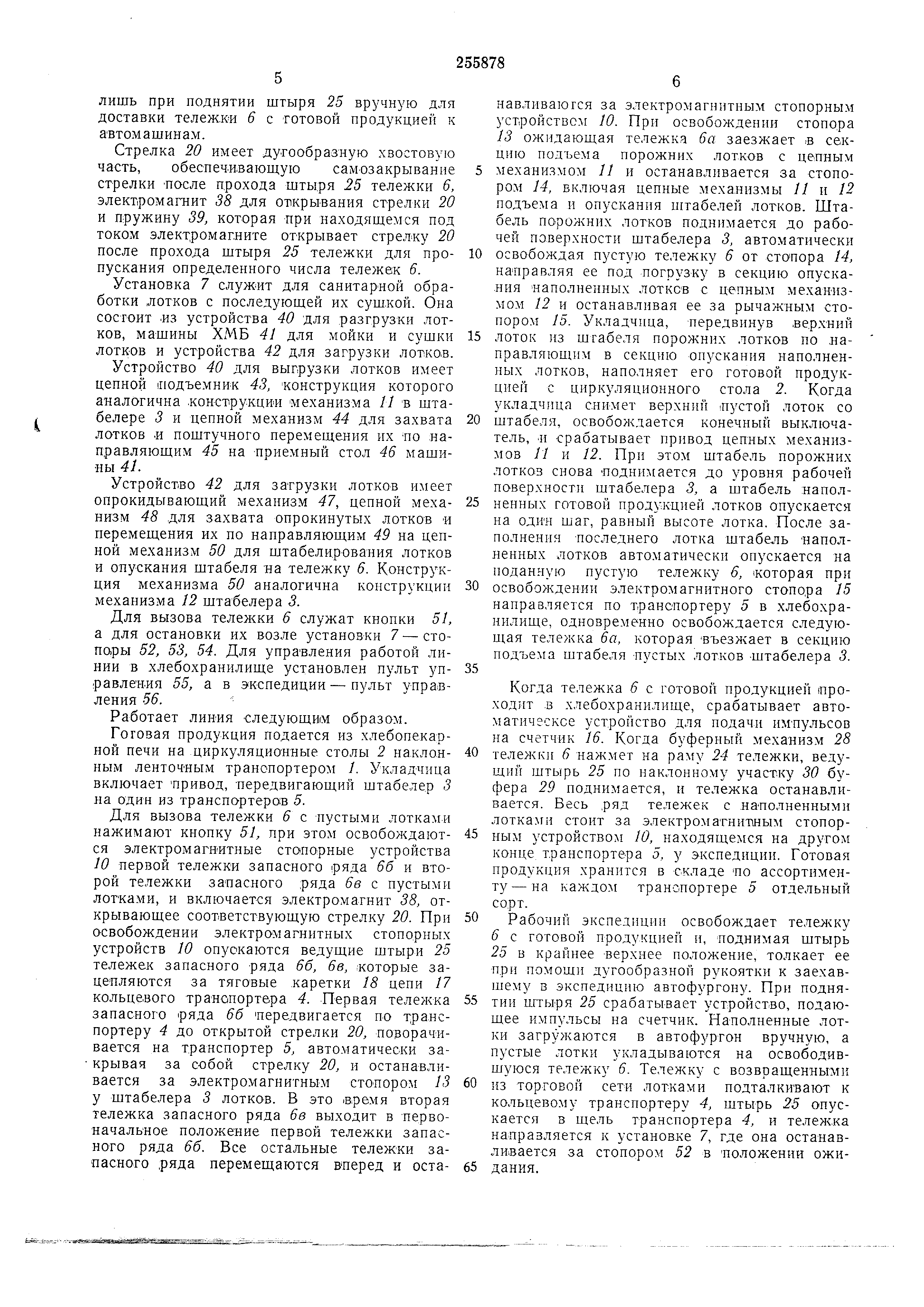 на транспортер 5 поодиночке или по рядам, состоящим из определенного количества тележек 6.. Транспортер 5 служит для перемещения тележек 6 со штабелями наполненных хлебом