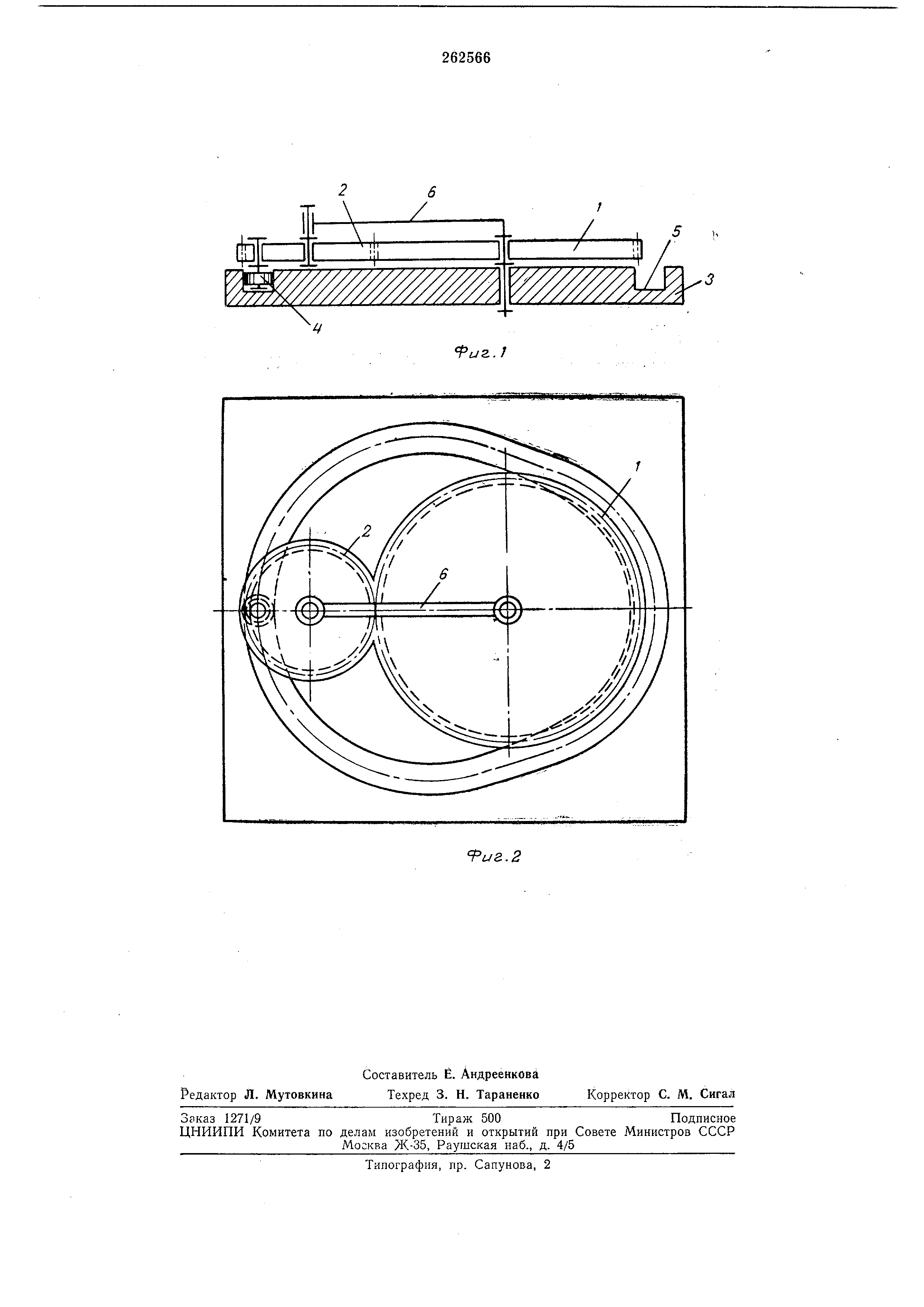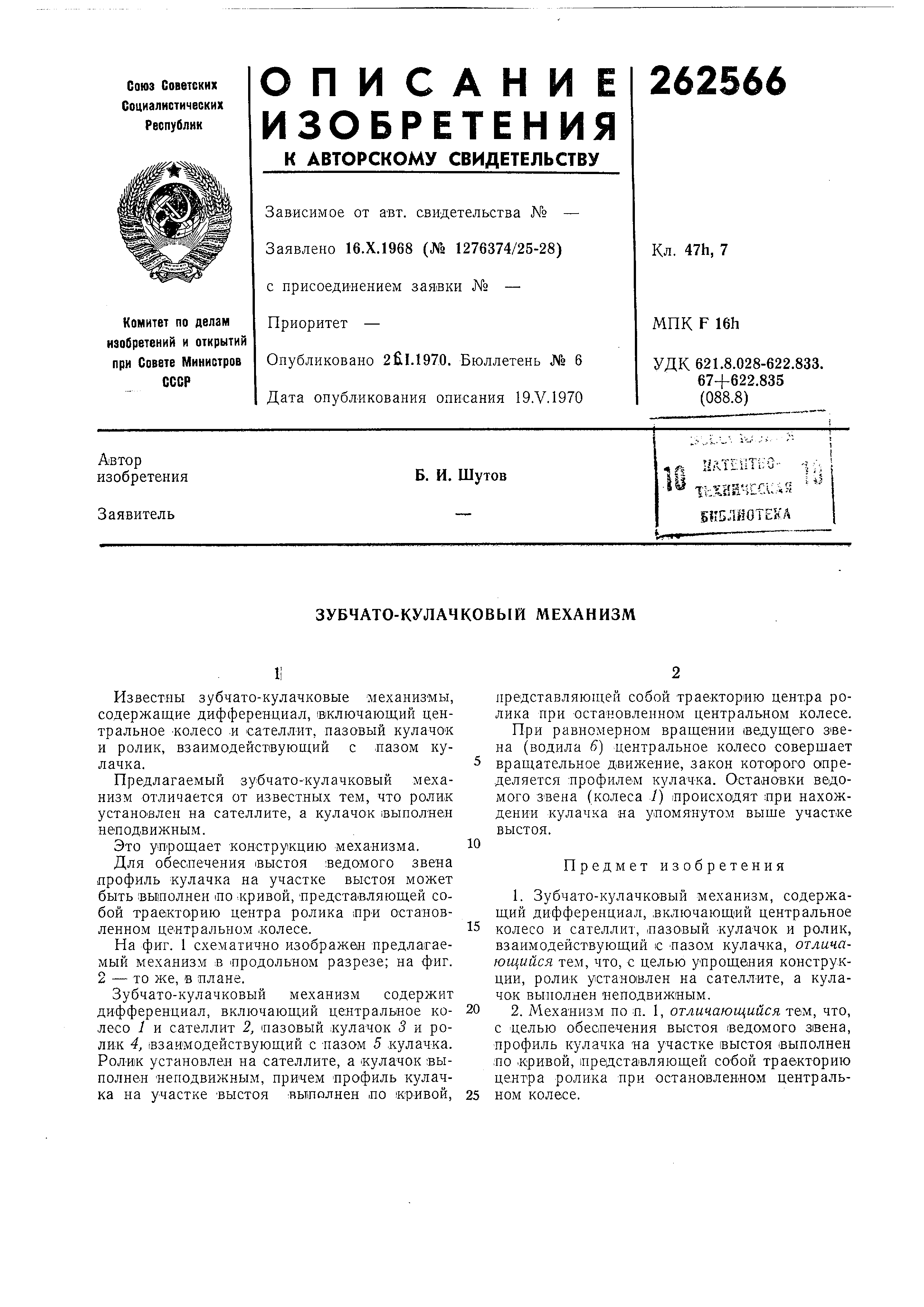 Известны зубчато-кулачковые механизмы, содержащие дифференциал, включающий центральное -колесо .и сателлит, пазовый кулачок и ролик, взаимодействующий с лазом кулачка . Предлагаемый зубчато-кулачковый механизм отличается от известных тем, что ролик установлен на сателлите, а кулачок выполнен неподвижным. Это упрощает конструкцию механизма. Для обеспечения выстоя ведомого звена профиль кулачка на участке выстоя может быть выполнен по -кривой, представляющей собой траекторию центра ролика при остановленном це«тральном колесе. На фиг. 1 схематично изо-бражеи предлагаемый механизм в продольном разрезе; на фиг. 2 - то же, в плане. Зубчато-кулачковый механизм содержит дифференциал, включающий центральное колесо 1 и сателлит 2, пазовый кулачок 5 и ролик 4, 1взаи1модействующий с пазом 5 кулачка. Ролик установлел на сателлите, а кулачок выполнен неподвижным, причем профиль кулачка на участке выстоя выполнен по кривой, представляющей собой траекторию центра ролика при остановленном центральном колесе. При равномерном вращении ведущего звена (водила 6 центральное колесо совершает вращательное движение, закон котррого определяется профилем кулачка. Остановки ведомого звена (колеса /) происходят ори нахождении кулачка на упомянутом выше участке выстоя. Предмет изобретения 1.Зубчато-кулачковый механизм, содержащий дифференциал, включающий центральное колесо и сателлит, пазовый кулачок и ролик, взаимодействующий с пазом кулачка, отличающийся тем, что, с целью упрощения конструкции , ролик установлен на сателлите, а кулачок выполнен неподвижным. 2.Механизм по п. 1, отличающийся тем, что, с щелью обеспечения выстоя ведомого звена, профиль кулачка на участке выстоя выполнен по кривой, представляющей собой траекторию центра ролика при остановленном центральном колесе.