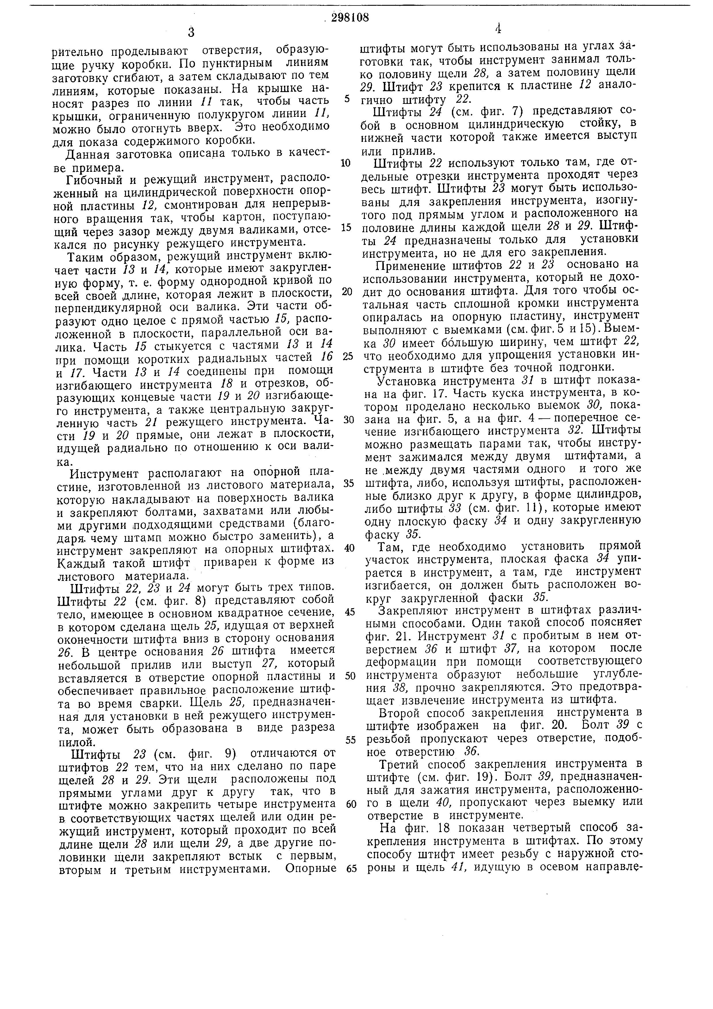 Штифты 23 (см. фиг. 9) отличаются от штифтов 22 тем, что на них сделано по паре щелей 2S и 29. Эти щели расположены под прямыми углами друг к другу так, что в штифте можно закрепить четыре инструмента в соответствующих частях щелей или один режущий инструмент, который проходит по всей длине щели 28 или щели 29, а две другие половинки щели закрепляют встык с первым, вторым и третьим инструментами. Опорные