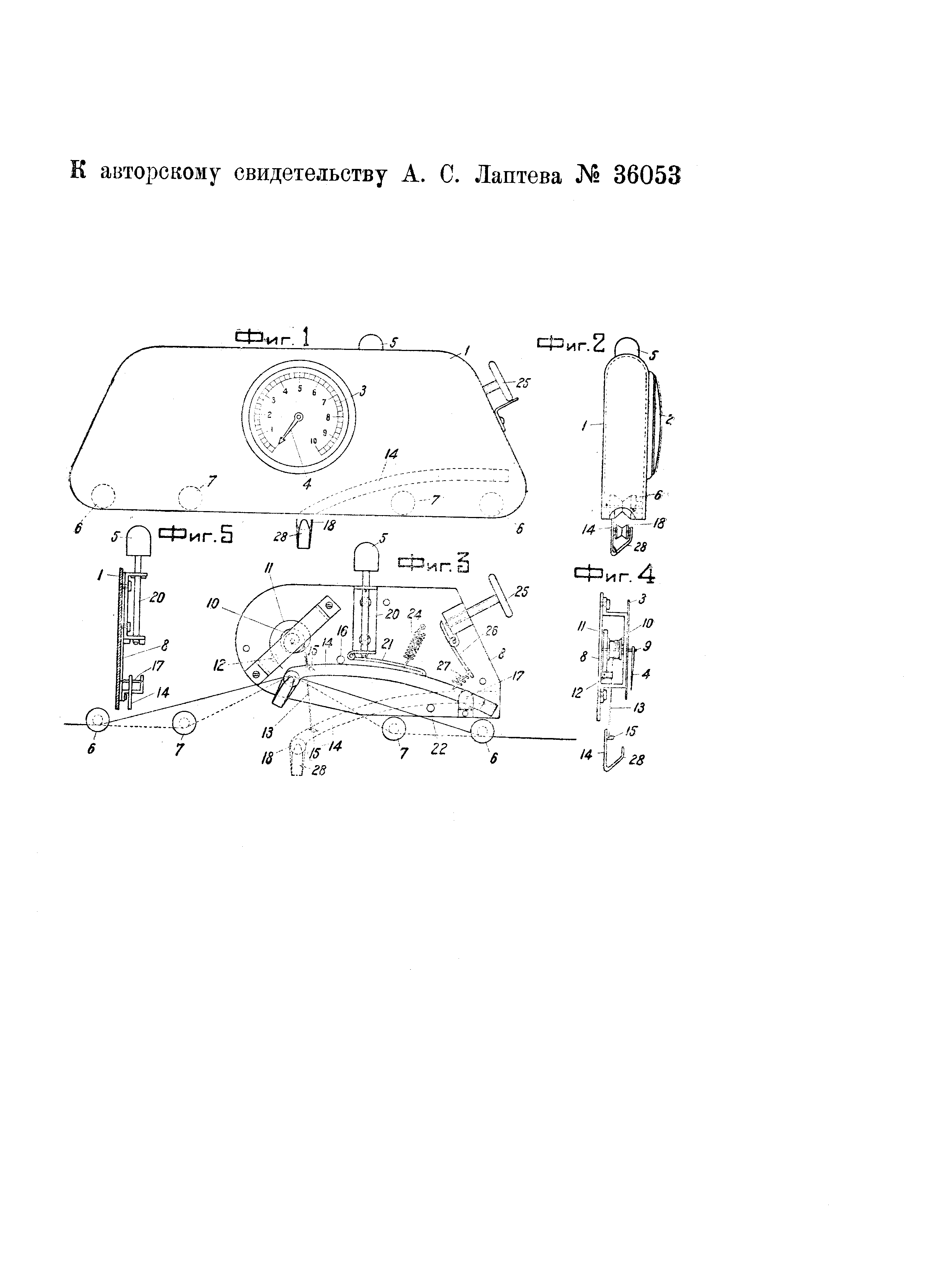 На свободном конце оси 9 сверху шкалы 3 закреплена стрелка 4. Стрелка 4 предохраняется стеклом 2 в кожухе 1 прибора. Нитка, одним концом закрепленная на барабанчик 10 и навернутая на него в несколько оборотов, подводится другим концом к рычагу 14, где крепится к валику 15. С помощью валика 15 при его поворотах стрелка 4 устанавливается на нулевое положение. Пружинка 11, стремясь развернуться, прижимает ниткой 13 рычаг 14 к упору 16. Рычаг 14 изготовлен из алюминия и снабжен на конце противовесом. Рычаг 14 выполнен поворотным на оси 17, а на другом конце его с поворотной и загнутой, как крюк, скобою 28 вставлен ролик 18.