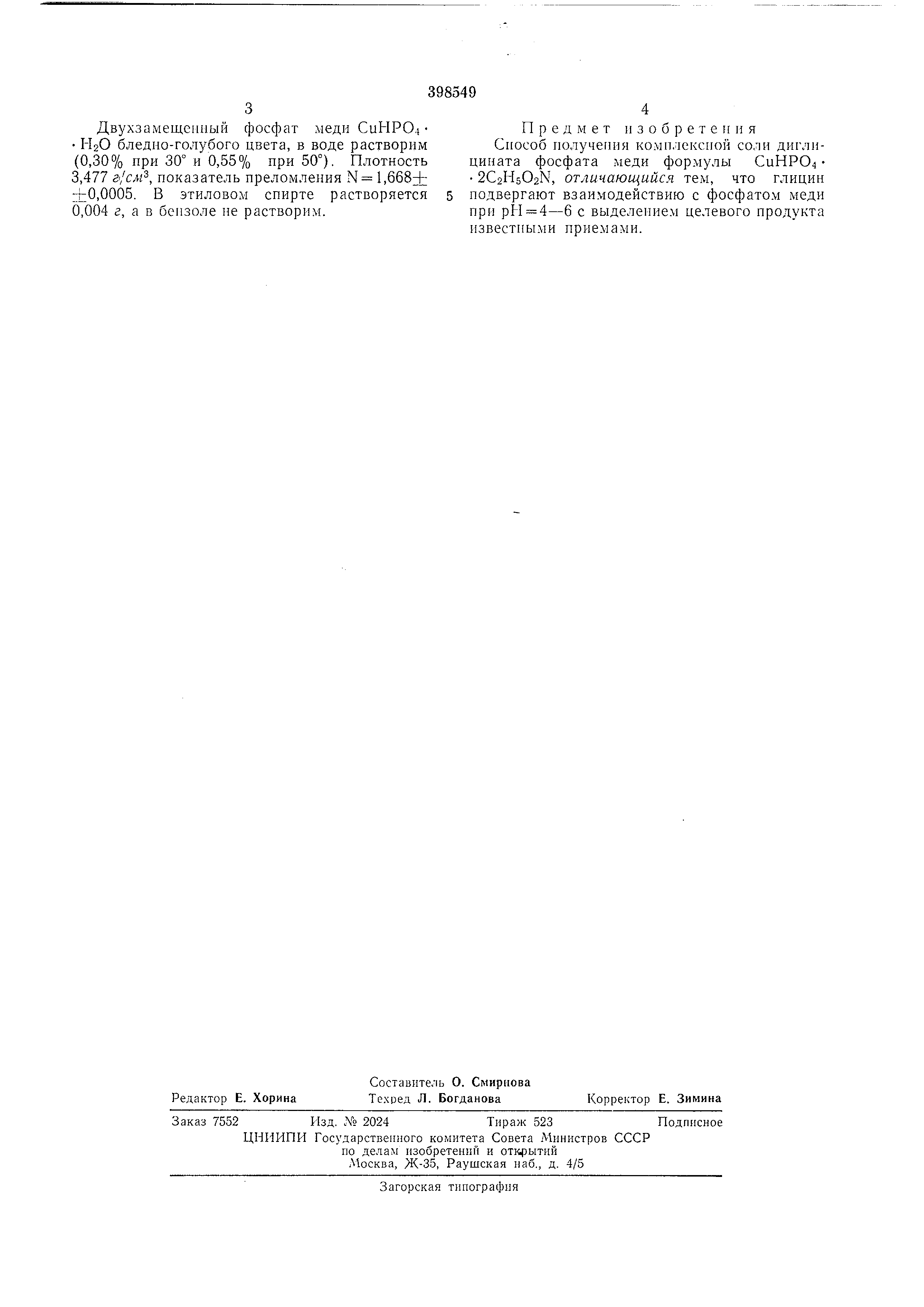 ,002. l o плeкcнaя соль диглпцпната фосфата меди по фнзнко-химическш, свойства.м