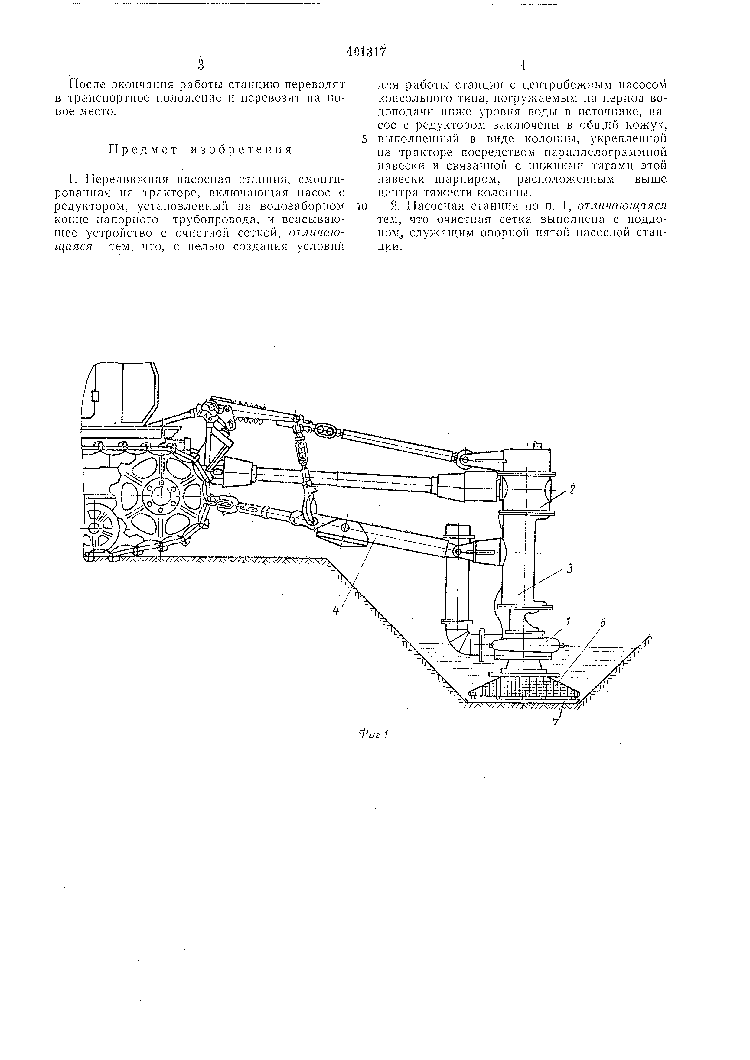 Предмет изобретения 1. Передвижная насосная станция, смонтированная на тракторе, включающая насос с