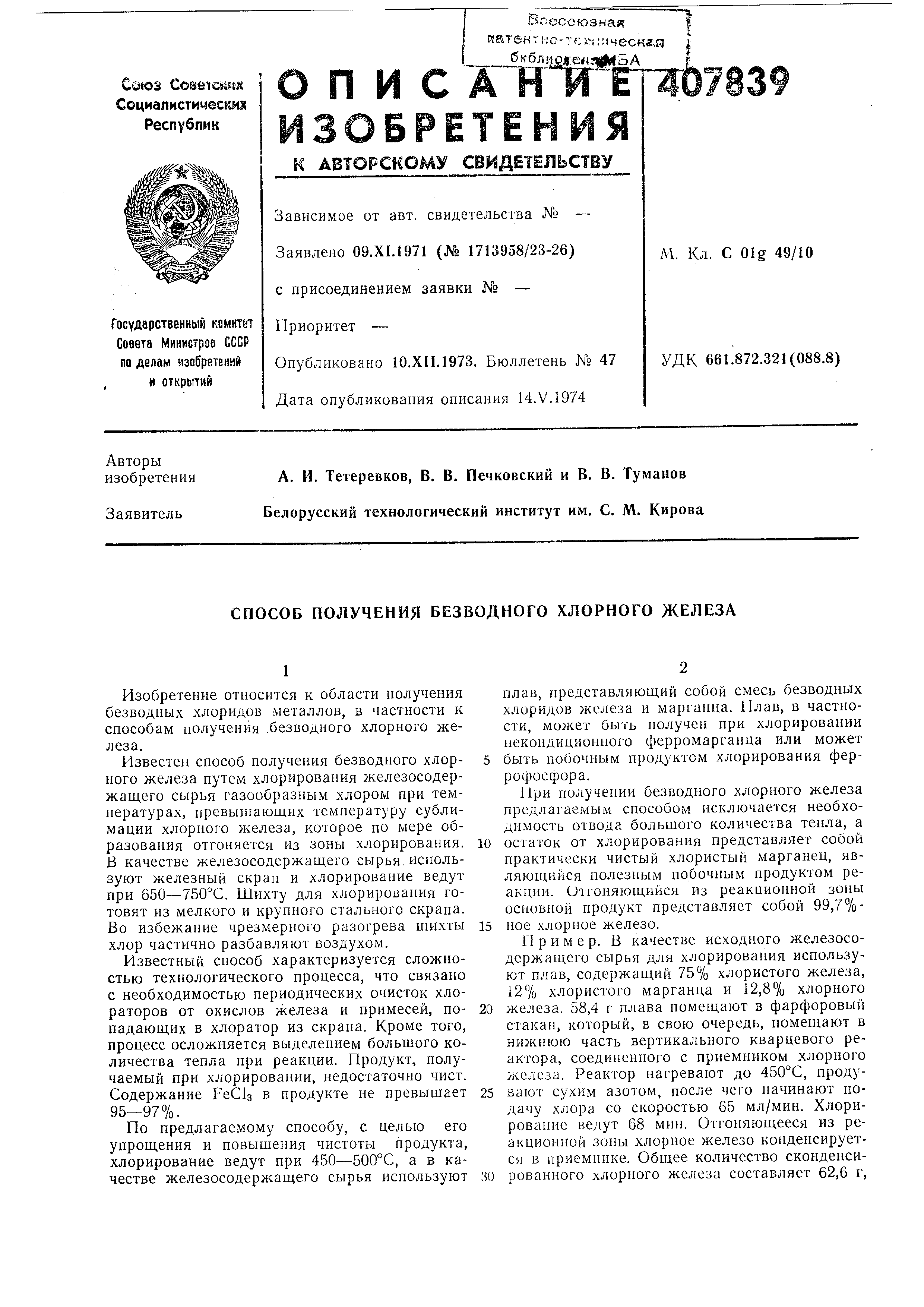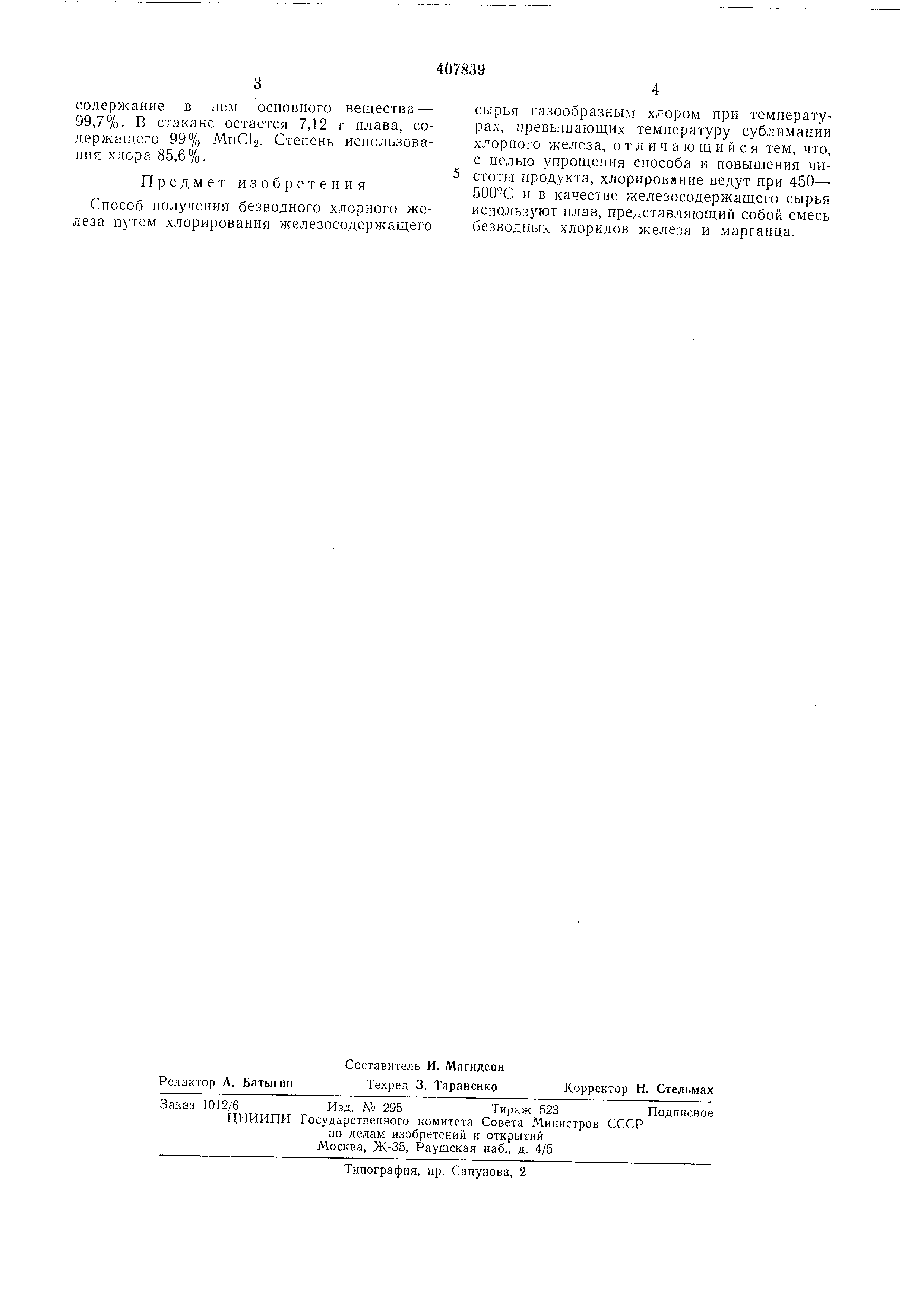 Предмет и з о о р е т е п и я Способ получепия безводного хлорного железа