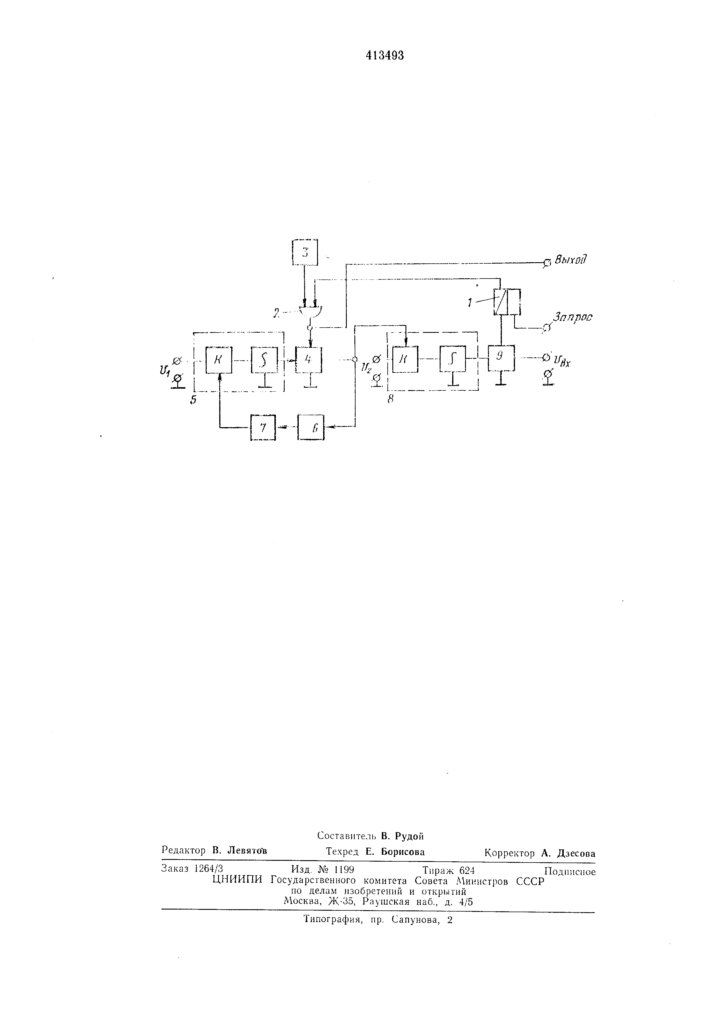 сигнала интегратора 5 с уровгювд входного сигнала t/вх. подаваемого иа вход блока сравнения, произойдет в момеит поступления п-ого имнульса. Запишем это условие: е, , 2,.„ . K,KJ. 2 U,,nU, оо -K-K-K-UU- ( -I - - АЗ А 2 1 i- z й I I i V / /Гз.А ,.Л ,.т„6.,, откуда определяется п - количество импульсов иа выходе предложенного устройства: / J/Bx2 п у u, K.-KZ-K.,-, Таким образом, предложенное устройство peniaeT поставленную задачу извлечения квадратного