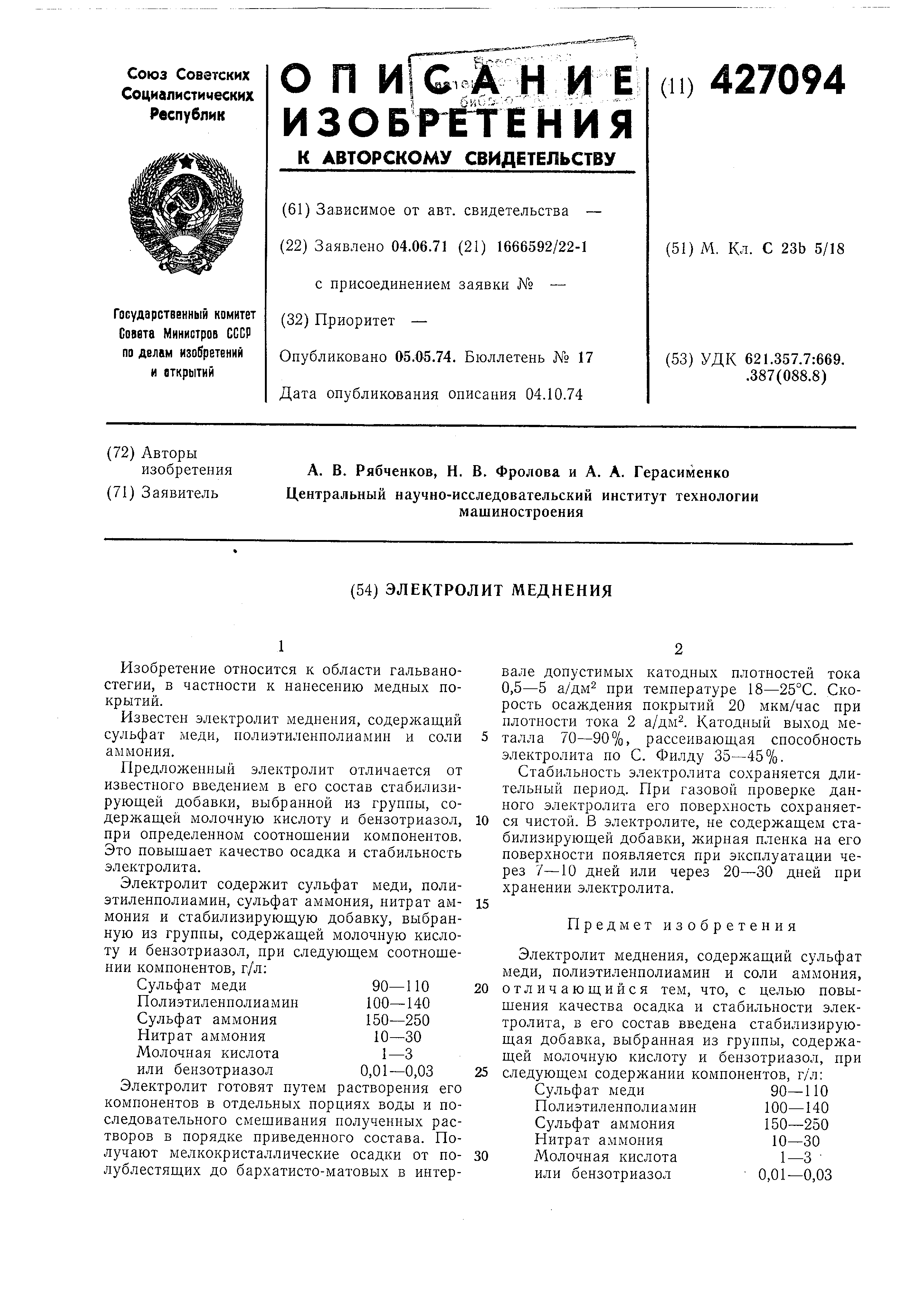 и бензотриазол, при следующем соотношении компонентов, г/л: Сульфат меди90-110 Полиэтиленполиамин100-140 Сульфат аммония150-250 Нитрат аммония10-30 Молочная кислота1-3 или бензотриазол0,01-0,03 Электролит готовят путем растворения его компонентов в отдельных порциях воды и последовательного