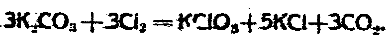 Ввиду того, что раствор калия бикарбоната, насыщенный угольной кислотой, весьма жадно и количественно поглощает хлор, возможно осуществить превращение поташа в хлорат и хлорид в виде непрерывного процесса с совершенно количественной утилизацией хлора: и выделением из реакционной системы чистой свободной от хлората угольной кислоты. Вследствие различной растворимости хлората калия и хлорида калия и изменения этих растворимостей с температурой, возможно путем правильного выбора первоначального состава реакционной смеси достичь раздельного выпадения в кристаллическом виде каждого из двух продуктов реакции бертолетовой соли и хлористого калия и тем самым избежать как необходимости специального разделения этих солей, так и всякого специального упаривания растворов. При этом маточный раствор после выделения из него хлористого калия (при 80-90%) и бертолетовой соли (при 15°) Идет снова в реакции с добавлением новой порции поташа и удаляется из цикла только при накоплении в нем посторонних загрязнений.