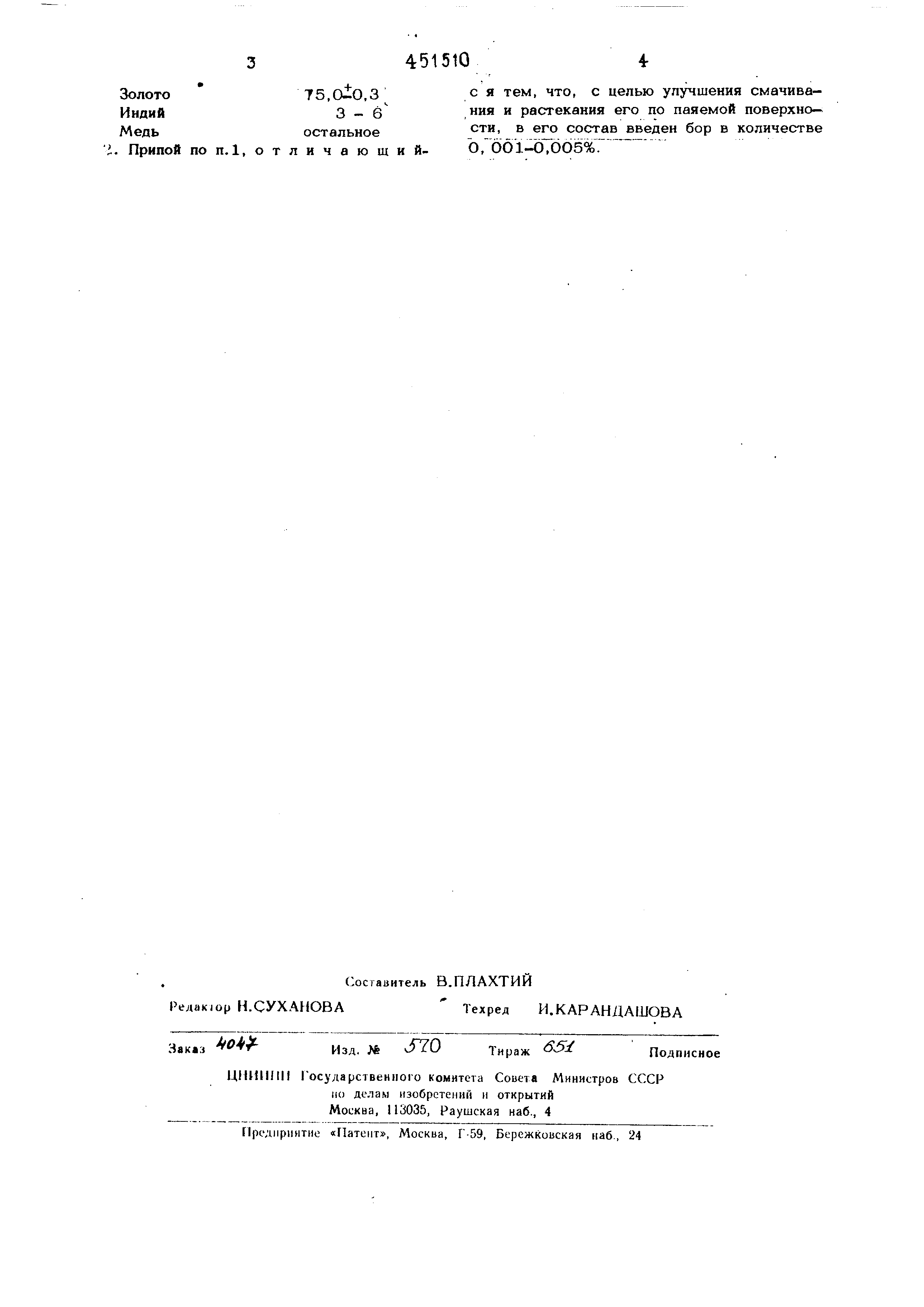 . Припой по п. 1. о т 451510475 .oio,3с я тем. что, с цепью улучшения смачиваз растекания его по паяемой поверхноостальное ™