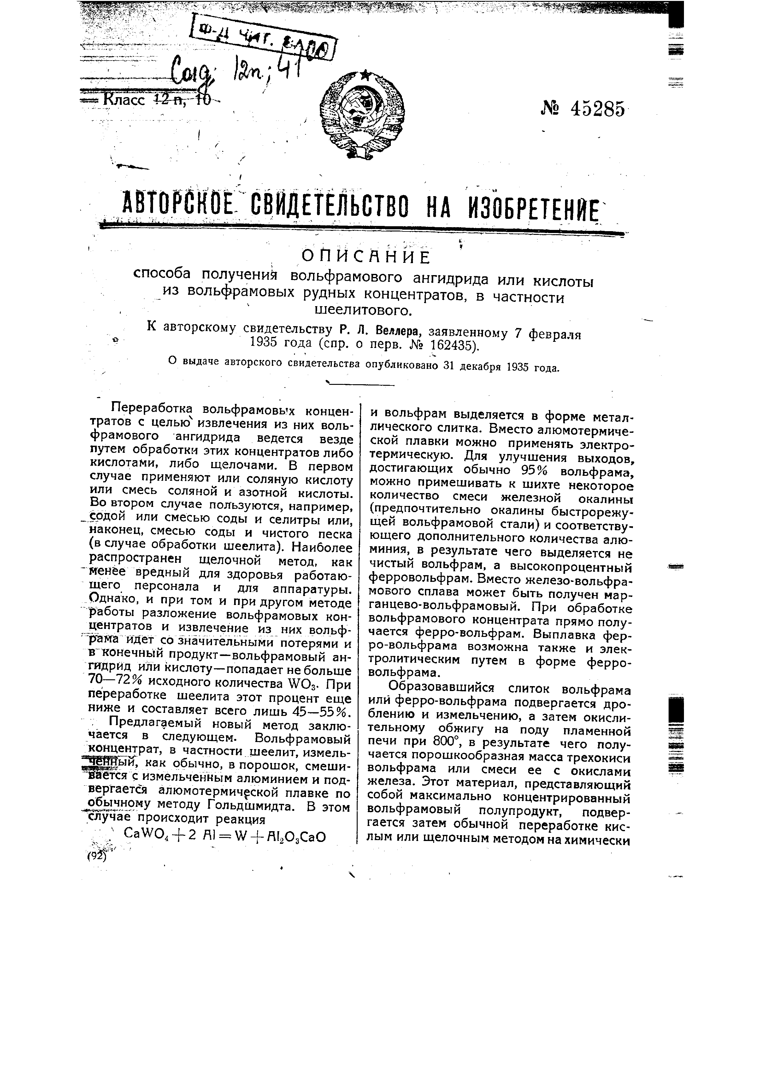 извлечение или использование вольфрама , чем известные и применяемые в настоящее время методы. Предмет изобретения. 1. Способ получения вольфрамового