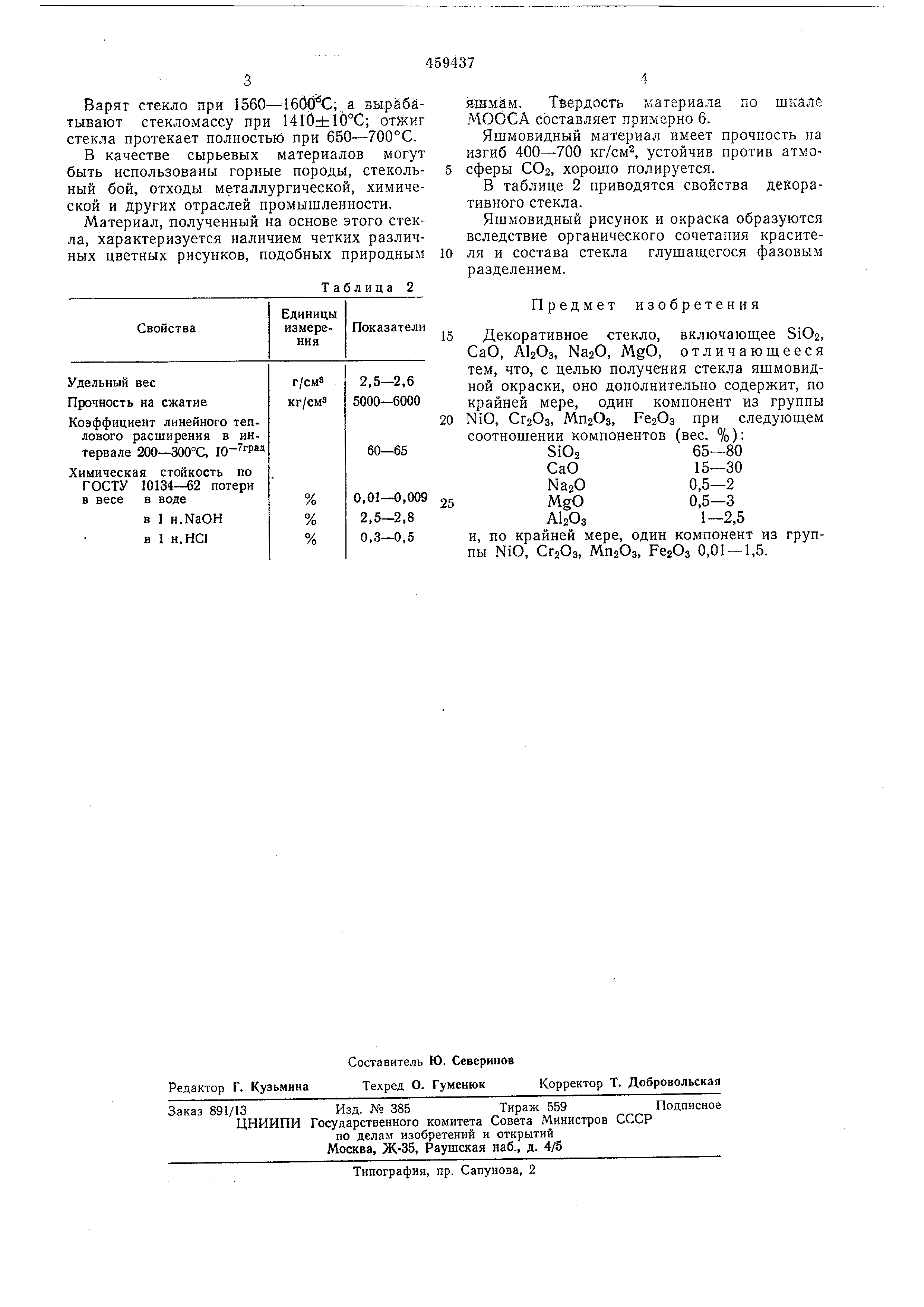 СОз, хорошо полируется. В таблице 2 приводятся свойства декоративного стекла. Яшмовидный рисунок и окраска образуются вследствие органического сочетания красителя