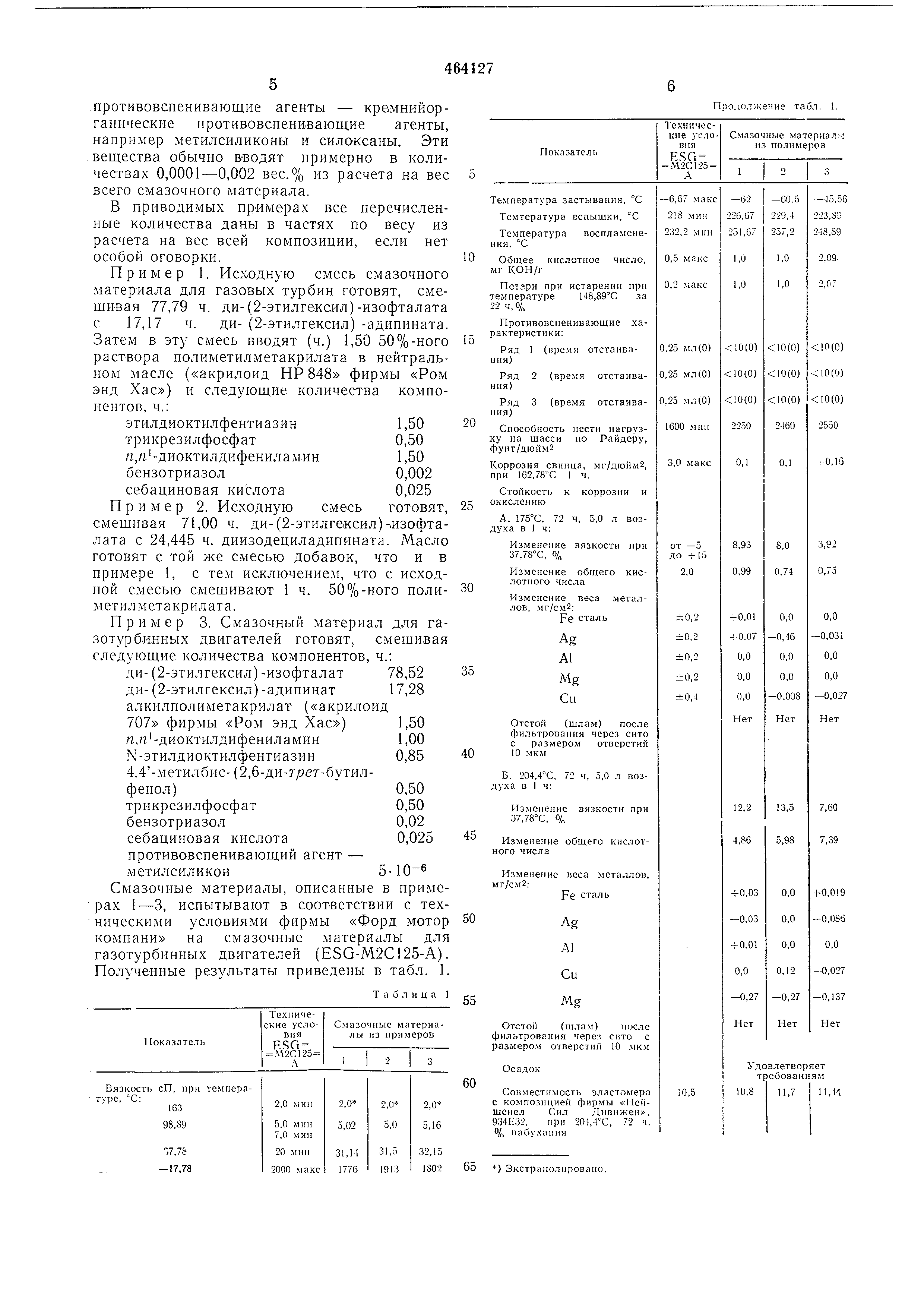 примере 1, с тем исключением, что с исходной смесью смешивают 1 ч. 50%-ного полиметилметакрилата . Пример 3. Смазочный материал для газотурбинных двигателей готовят, смешивая