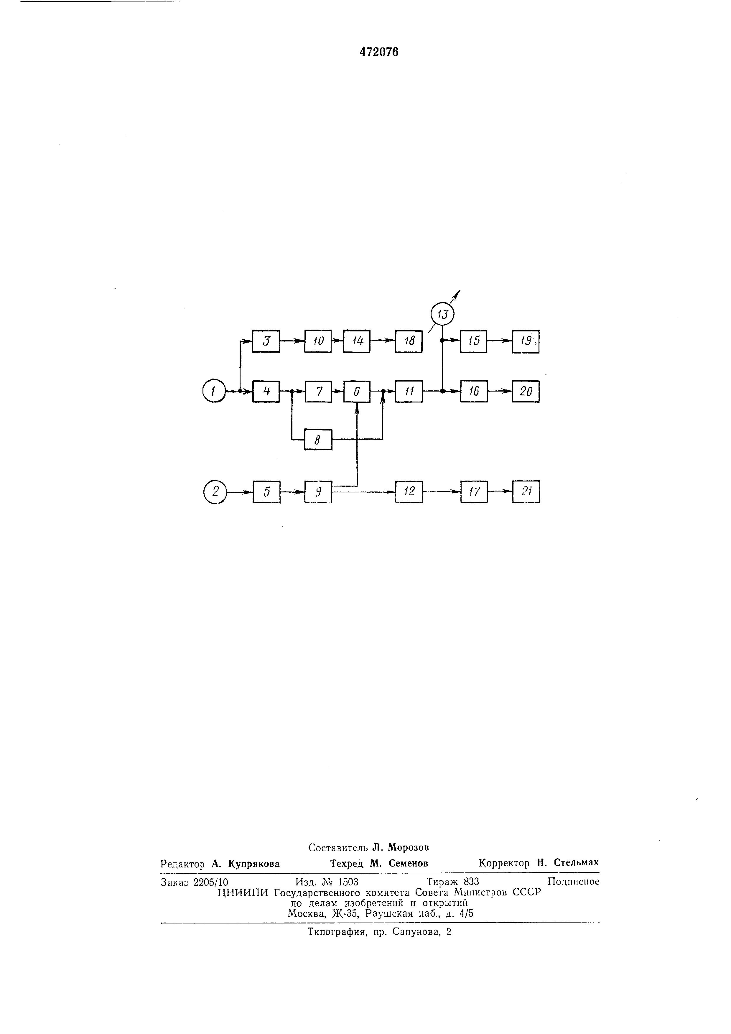 прибор 13, пороговые элементы 14- 17 и исполнительные органы 18-21. Работа предложенного устройства происходит следующим образом. Синусоидальный сигнал с выхода датчика 1 скорости, кинематически связанного с лентой
