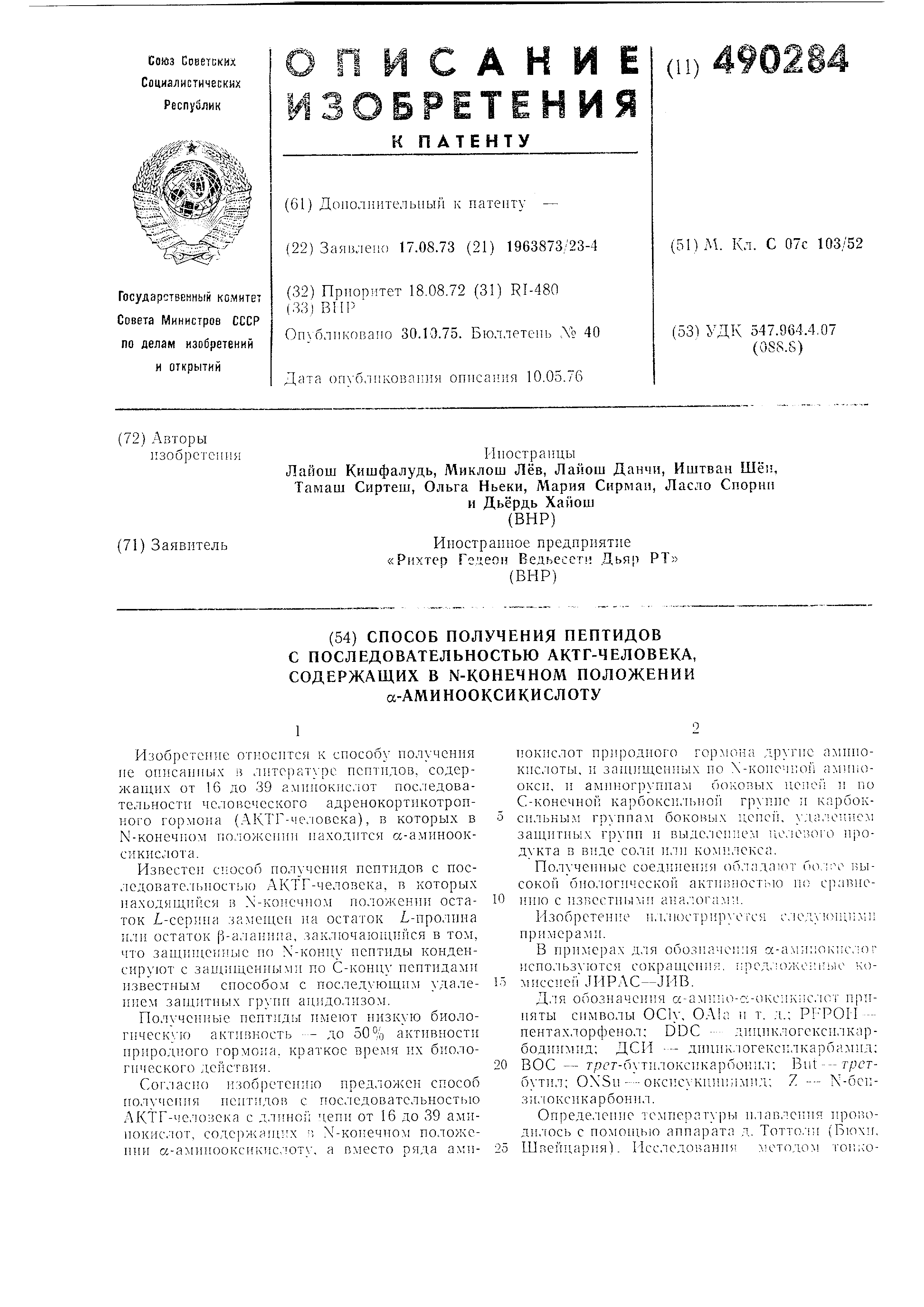 1.Способ получения пептидов с последовательностью АКТГ-человека, содержащих в N-конечном положении сс-аминооксикислоту, отличающийся тем, что, от пептидов последовательности от АКТГ- до , содержащих в N-конечном положении сс-аминооксикислоту и вместо ряда аминокислот природного человеческого АКТГ другие аминокислоты и защищенных по N-конечной аминооксигрунпе и аминогруппам боковых цепей, а также но конечной карбоксильной группе и карбоксильным группам боковых цепей, отщепляют защитные группы, и полученные соединения переводят в соли или комплексы известным способом.