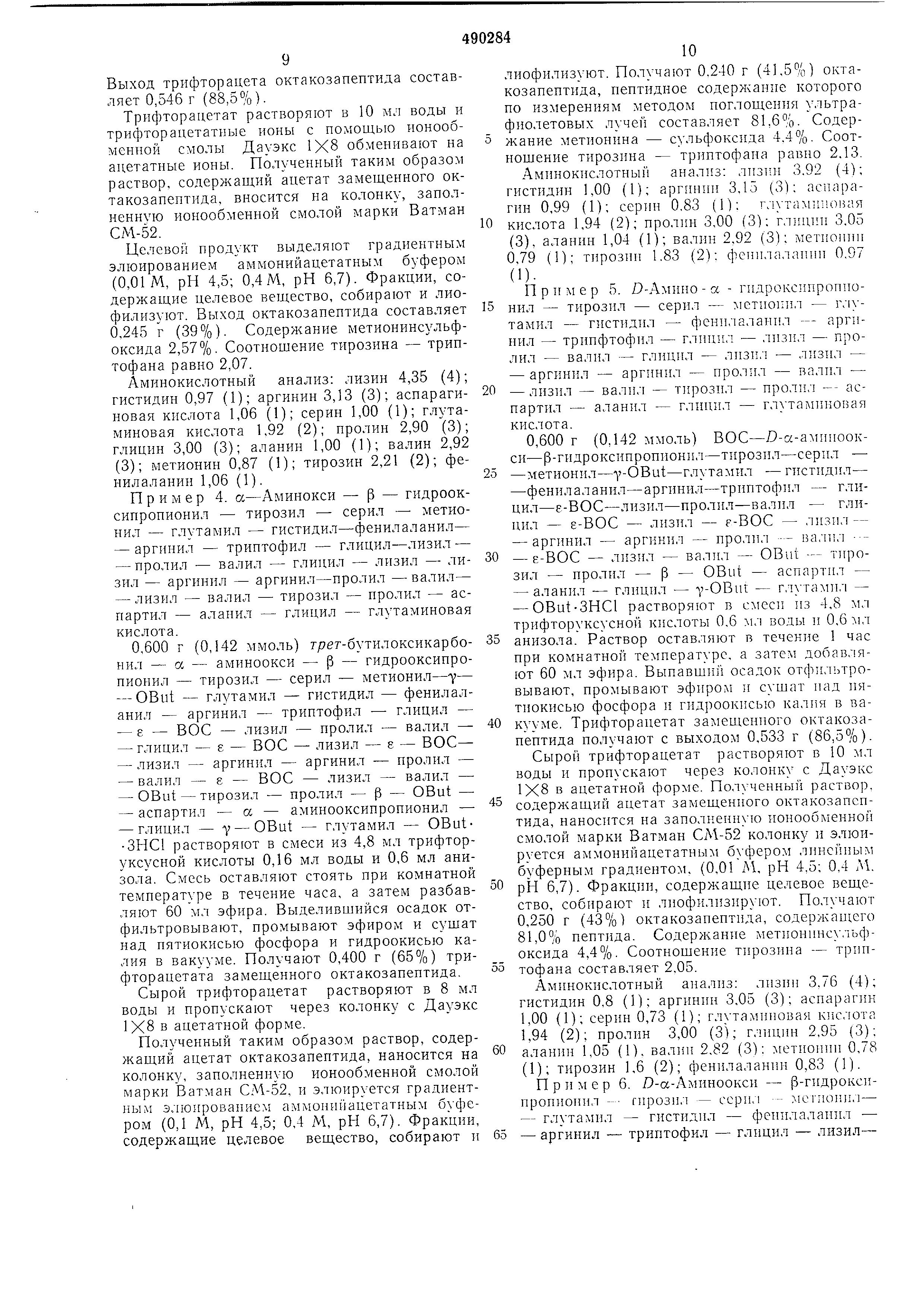 -Y - OBut - глутамил - OBut-НС растворяют в смеси из 4,8 мл трифторуксусной кислоты , 0,6 мл воды и 0,6 мл анизола. Раствор оставляют стоять при комнатной температуре в течение 1 час, л затем разбавляют 60 мл эфира. Быцавши; осадок огфцл1)Тровывают, Выход трифторацета октакозапептида составляет 0,546 г (88,5%). Трифторацетат растворяют в 10 мл воды и трифторацетатные ионы с помощью ионообменной смолы Даузкс 1X8 обменивают на ацетатные ионы. Полученный таким образом раствор, содержащий ацетат замещенного октакозапептцда , вносится на колонку, заполненную цонообменной смолой марки Ватман СМ-52. Целевой продукт выделяют градиентным элюированием аммонийацетатным буфером (0,01 М, рН 4,5; 0,4 М, рН 6,7). Фракции, содержащие целевое вещество, собирают и лиофилизуют . Выход октакозапептида составляет 0,245 г (39%). Содержание метионпнсульфоксида 2,57%. Соотнощение тирозина - триптофана равно 2,07. Аминокислотный анализ: лизин 4,35 (4); гиетидин 0,97 (1); аргинин 3,13 (3); аспарагиновая кислота 1,06 (1); серин 1,00 (1); глутаминовая кислота 1,92 (2); пролин 2,90 (3); глицин 3,00 (3); аланин 1,00 (1); валин 2,92 (3); метионин 0,87 (1); тирозин 2,21 (2); фенила л анин 1,06 (1). Пример 4. а-Аминокси - |3 - гидрооксипропионил - тирозил - серил - метионил - глутамил - гистидил-фенилаланил- -аргииил - триптофил - глицил-лизил - -пролил - валил - глицил - лизил - лизил - аргинил - аргинил-пролил -валил- -лизил - валил - тирозил - пролил - аспартил - аланил - глицил - глутаминовая кислота. 0,600 г (0,142 ммоль) г/оет-бутилоксикарбонил - а - аминоокси - р - гидрооксипропионил - тирозил - серил - метионил-7- -OBut - глутамил - гистидил - фенилаланил - аргинил - триптофил - глицил - - - вое - лизил - пролил - валил - -глицил - 8 - вое - лизил - 8 - вое- -лнзил - аргинил - аргинил - пролил - -валил - 8 - вое - лизил - валил - -OBut - тирозил - пролил - р - OBut - -аспартил - ее - аминооксипропионил - -глицил - 7 - OBut - глутамил - OButЗНе растворяют в смеси из 4,8 мл трифторуксусной кислоты 0,16 мл воды и 0,6 мл анизола , емесь оставляют стоять при комнатной температуре в течение часа, а затем разбавляют 60 мл эфира. Выделившийся осадок отфильтровывают , промывают эфиром и сущат над пятиокисью фосфора и гидроокисью калия в вакууме. Получают 0,400 г (65%) трифторацетата замещенного октакозапептида. еырой Трифторацетат растворяют в 8 мл воды и пропускают через колонку с Дауэкс 1X8 в ацетатной форме. Полученный таким образом раствор, содержащий ацетат октакозапептида, наносится на колонку, заполненную ионообменной смолой марки Ватман еМ-52, и элюируется градиентным элюированием аммонийацетатным буфером (0,1 М, рН 4,5; 0,4 М, рН 6,7). Фракции, содержащие целевое вещество, собирают и лиофилизуют. Получают 0.240 г (41,5%) октакозапептида , пептидное содержание которого по измерениям методом поглощения ультрафиолетовых лучей составляет 81,6%. Содержание метионина - сульфоксида 4,4%. еоотнощение тирозина - триптофана равно 2,13. Аминокислотный ана,1из: лизин 3,92 (4); гиетидин 1,00 (1); аргинин 3,15 (3); аспарагин 0,99 (1); серин 0.83 (1); глутаминовая кислота 1,94 (2); пролин 3,00 (3); глицин 3,05 (3), аланин 1,04 (1); валин 2,92 (3); метнопин 0,79 (1); тирозин 1.83 (2): феннлалапин 0.97 Пример 5. й-Амино - я - гидроксипропиоНИЛ - тирозил - серил - метиопил - r;iyтамил - гистидил - фснилаланил - аргинил - трипфтофил - глицил - лизил - пролил - валил - глицил - лизил - лизил - -аргииил - аргинил - проли,т - валил - - лизил - валил - тирозил - пролом -- аспартил - алани,т - глицил - глутамнногззя кислота. 0,600 г (0,142 ммоль) ВОе-D-я-амииоок