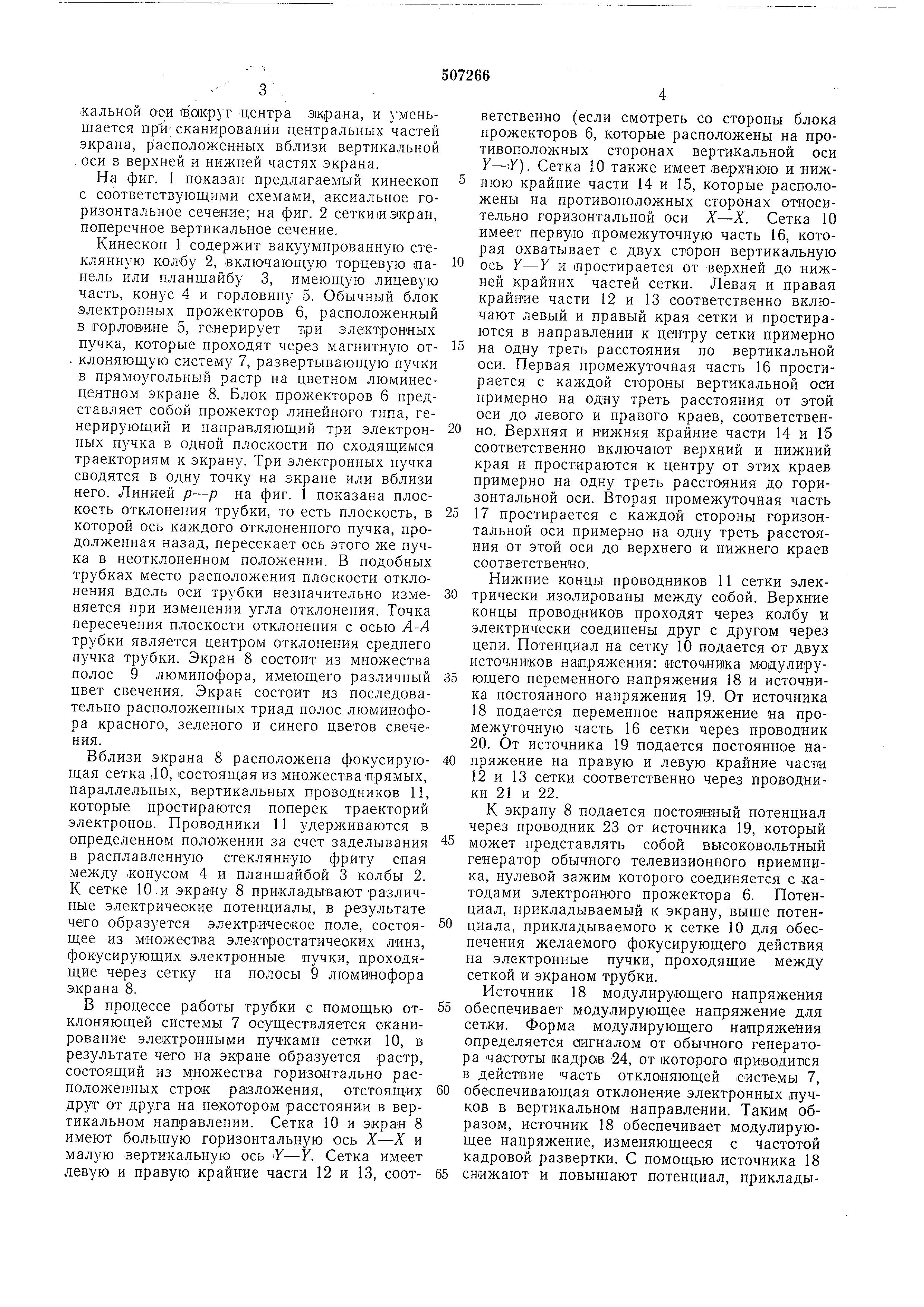 Вблизи экрана 8 расположена фокусирующая сетка ilO, состоящая из множествапрямых, параллельных, вертикальных проводников 11, которые простираются поперек траекторий электронов. Проводники 11 удерживаются в определенном положении за счет заделывания в расплавленную стеклянную фриту спая между (Конусом 4 и планшайбой 3 колбы 2. К сетке 10.и экрану 8 прикладывают различные электрические потенциалы, в результате чего образуется электрическое поле, состоящее из множества электростатических линз, фокусирующих электронные пучки, проходящие через сетку на полосы 9 люминофора экрана 8.