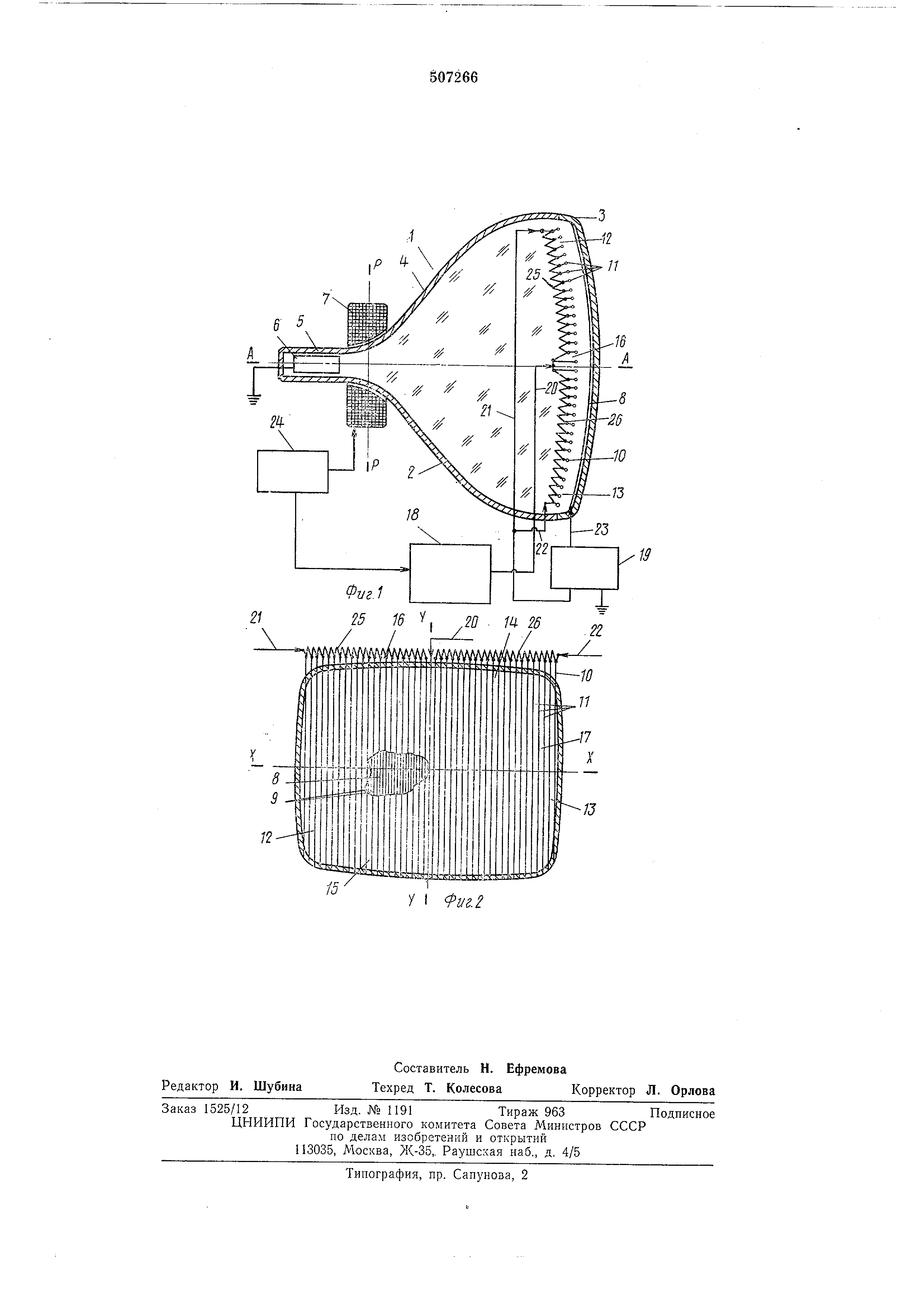 левой и правой крайних частых сетка 10 содержит два сопротивления 25 и 26, которые электрически соединяют между собой верхние концы проводников сетки. Внутренние концы сонротивлепий 25 и 26 соответственно соедипены между собой и с двумя центральными проводниками сетки, на которые подается модулирующее напряжение от источника 18. Остальные проводники сетки последовательно электрически соединены с ответвлениями о сопротивлений в направлении к левой и прэвой крайним частям 12 и 13. На крайних проводниках сетки поддерживается постоянное напряжение с помощью источника 19. Величина этого напряжения выбирается с целью