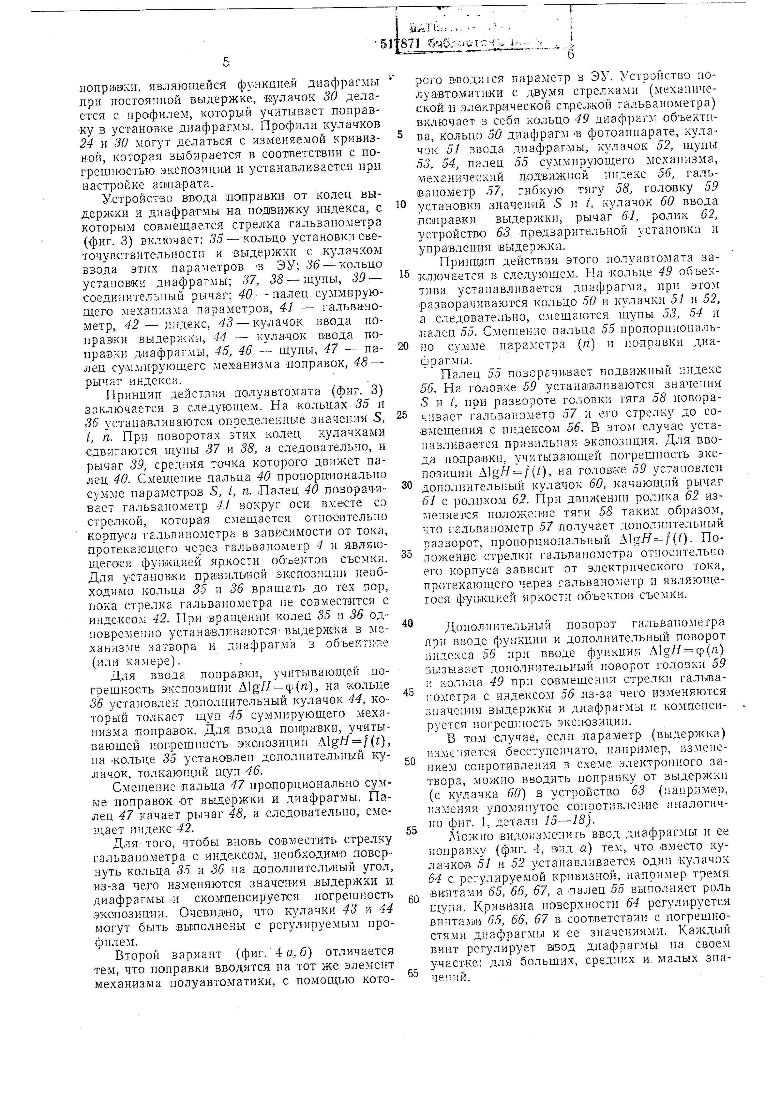 погрешности эюспозиции. Для ввода 5 nonpaiBKH, являющейся функцией диафрагмы при постоянной выдержке, кулачок 30 делается