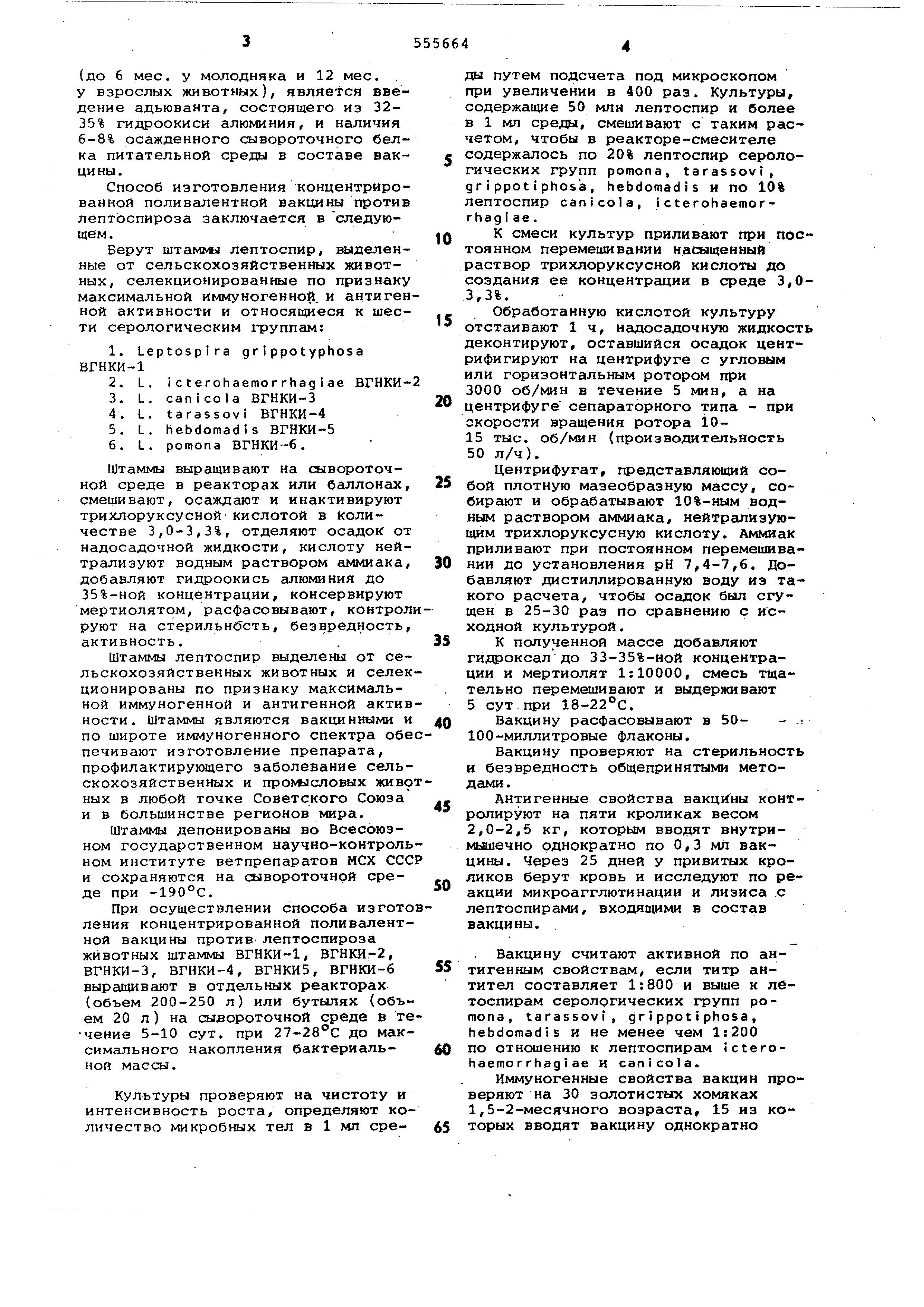 , вызывающей длительный иммунитет -высокой напряженности. Это достигается тем, что в качестве исходных штаммов берут штаммы лептоспир: ВГНКИ-1, ВГНКИ-2, ВГНКИ-3, ВГНКИ-4, ВГНКИ-5, ВГНКИ-б, а осаждение