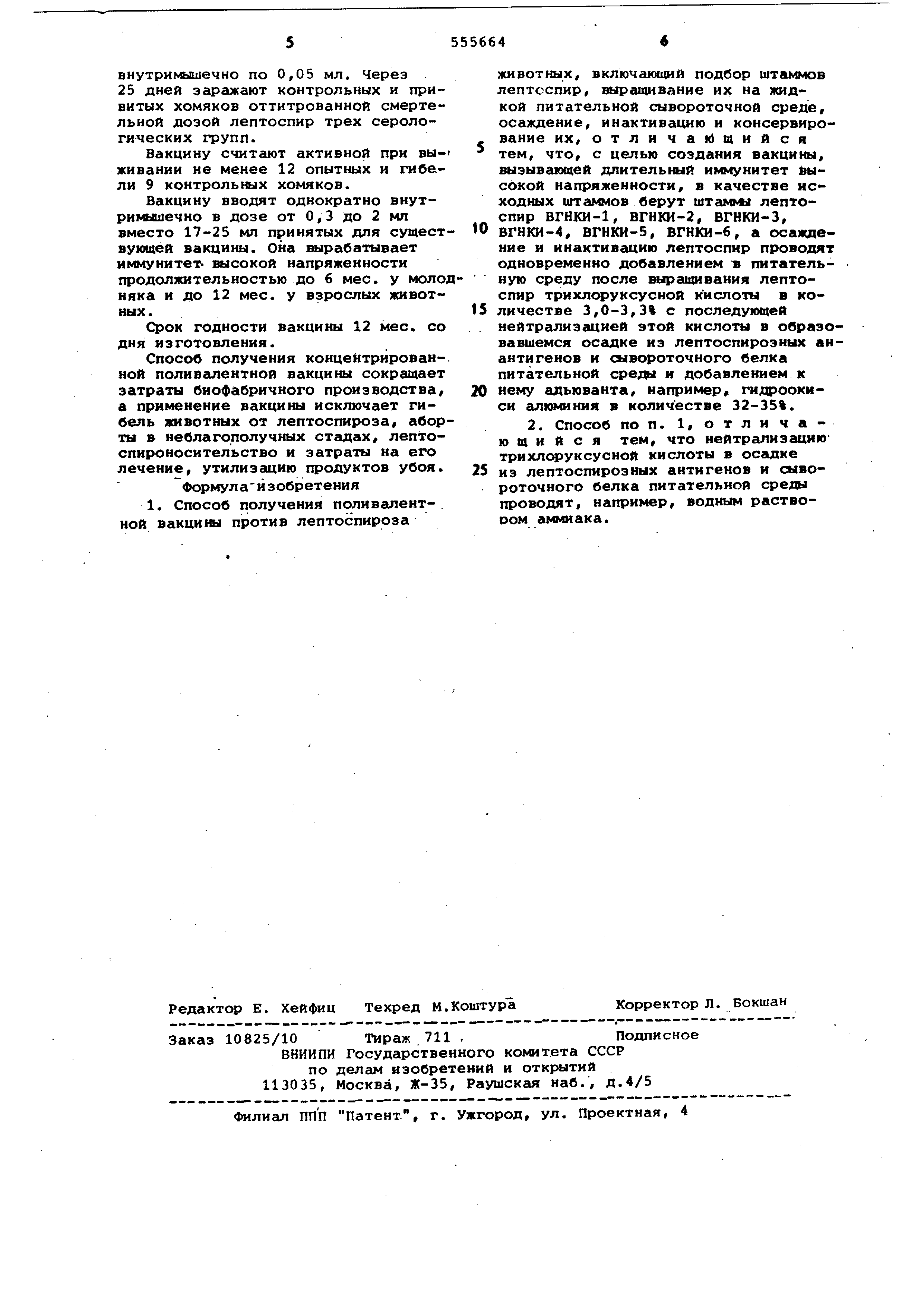 ной вакцины против лептоспироза животных штаммы ВГНКИ-1, ВГНКИ:-2, ВГНКИ-3, ВГНКИ-4, ВГНКИ5, ВГНКИ-6