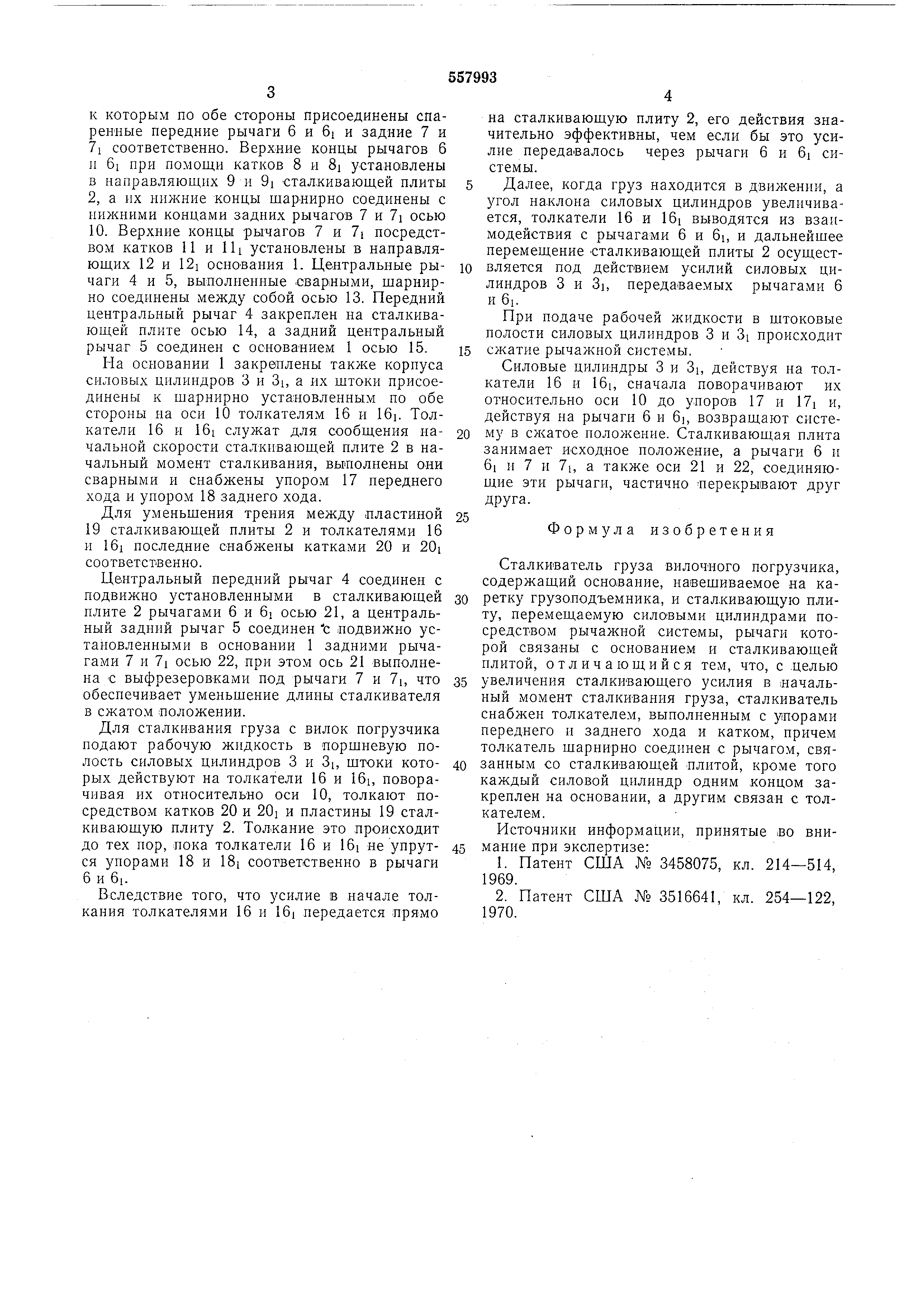 эти рычаги, частично перекрывают друг друга. . Формула изобретения Сталкиватель груза вилочиого погрузчика,