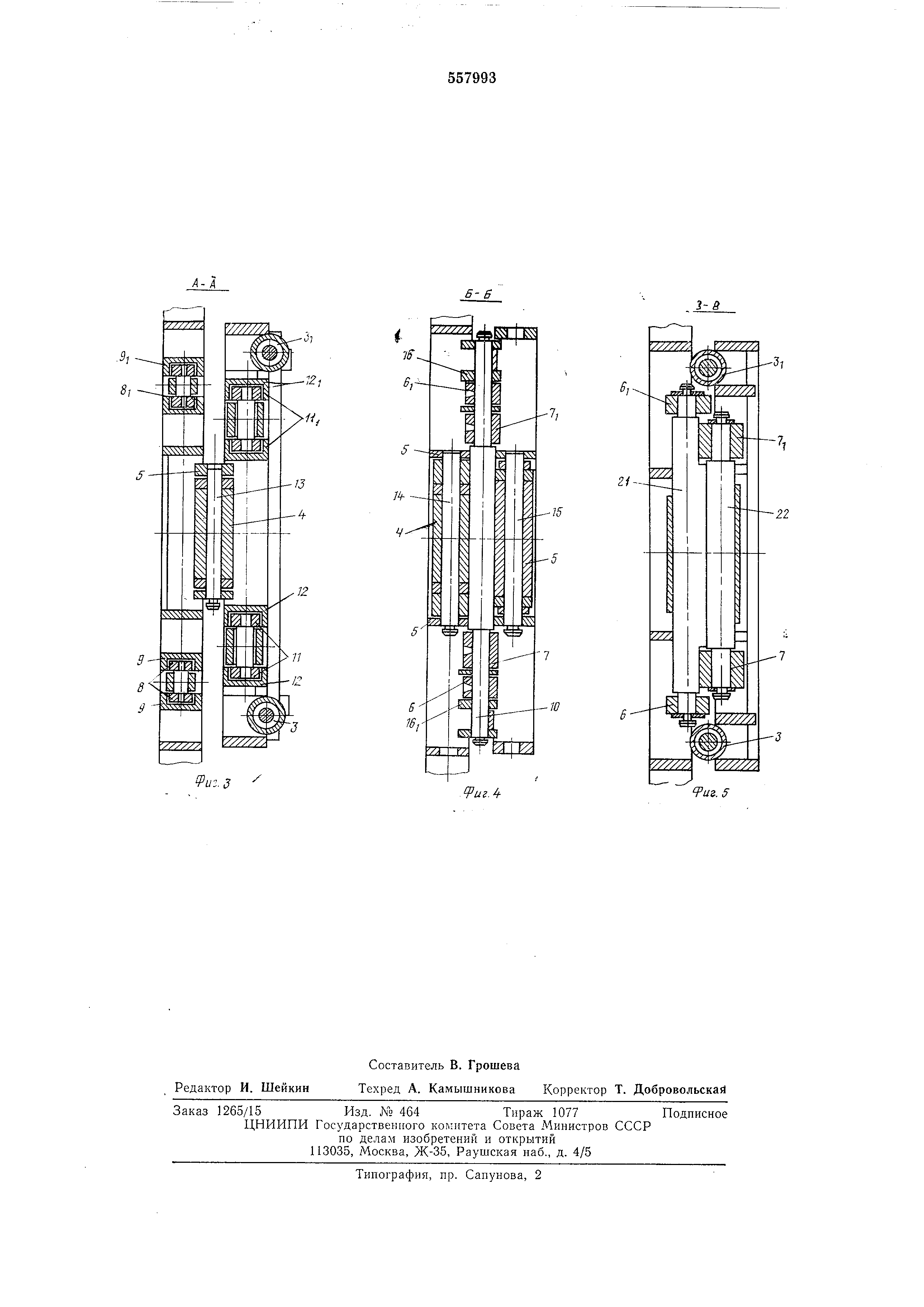 занимает исходное иоложение, а рычаги 6 и 6i и 7 и 7ь а также оси 21 и 22, соединяющие
